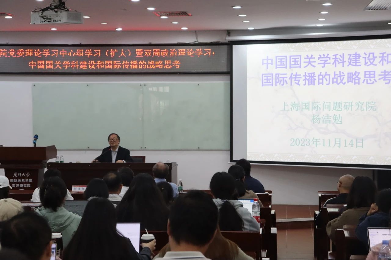 2023年11月14日下午,南强学术讲座第1144讲暨国际关系学院/南洋研究院党委理论学习中心组(扩大)专题学习会在厦门大学南安楼101会议室举行。本次讲座特邀杨洁勉博士为主讲人,主题为“中国国关学科建设和国际传播的战略思考”。杨洁勉博士曾任上海国际问题研究院党组书记、院长,现为该院学术咨询委员会主任、研究员,兼任中国国际关系学会副会长、上海市国际关系学会会长、上海市国际战略学会会长、国家社科基金评审专家组成员、教育部社科项目评审专家,获“国务院特殊津贴”和“上海市杰出专业人士”荣誉称号,主持过多项国家和上海市重大社科项目。厦门大学国际关系学院/南洋研究院李一平教授主持讲座。