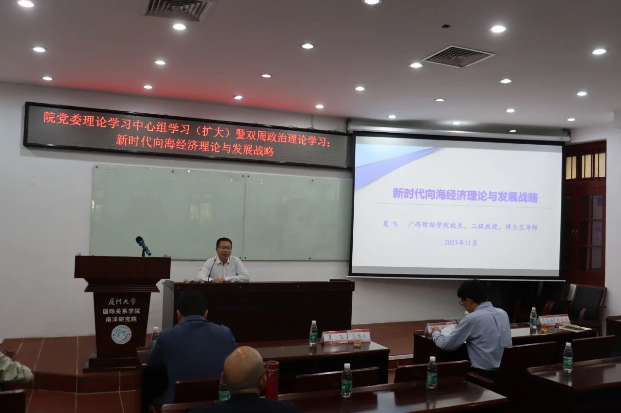 2023年11月16日上午,南强学术讲座第1208讲暨国际关系学院/南洋研究院党委理论学习中心组(扩大)专题学习会在厦门大学南安楼101会议室举行。本次讲座特邀广西财经学院校长夏飞为主讲人,主题是“新时代向海经济理论与发展战略”。夏飞校长现任广西财经学院二级教授、博士生导师,是国家万人计划哲学社会科学领军人才、全国文化名家暨四个一批人才、新世纪百千万人才工程国家级人选、国务院政府特殊津贴专家、教育部新世纪优秀人才支持计划人选、广西优秀专家、广西首批文化名家暨四个一批人才,同时也是国家社会科学基金学科组评审专家、教育部本科教学合格评估和审核评估专家。厦门大学国际关系学院/南洋研究院党委书记邱旺土担任主持人,厦门大学国际关系学院/南洋研究院吴崇伯教授担任与谈人。