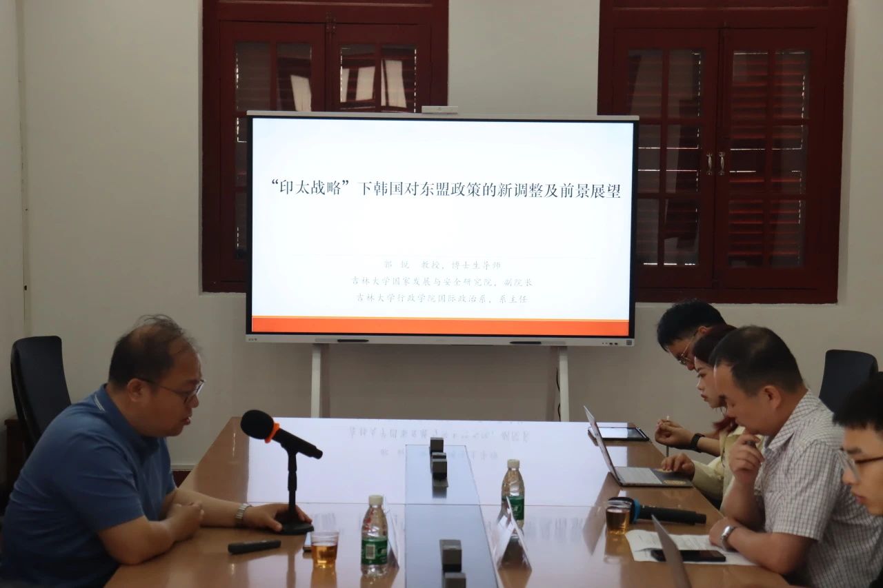 2024年5月31日上午,南洋问题与全球视野系列讲座第四十七讲在厦门大学南安楼309会议室举行。本次讲座特邀郭锐教授为主讲人,主题是“‘印太战略’下韩国对东盟政策的新调整及前景展望”。郭锐教授是吉林大学国家发展与安全研究院副院长兼东北亚安全研究中心主任,重点研究东北亚政治、国际安全与军备控制、朝鲜半岛问题等。厦门大学国际关系学院/南洋研究院金向东助理教授担任主持人。