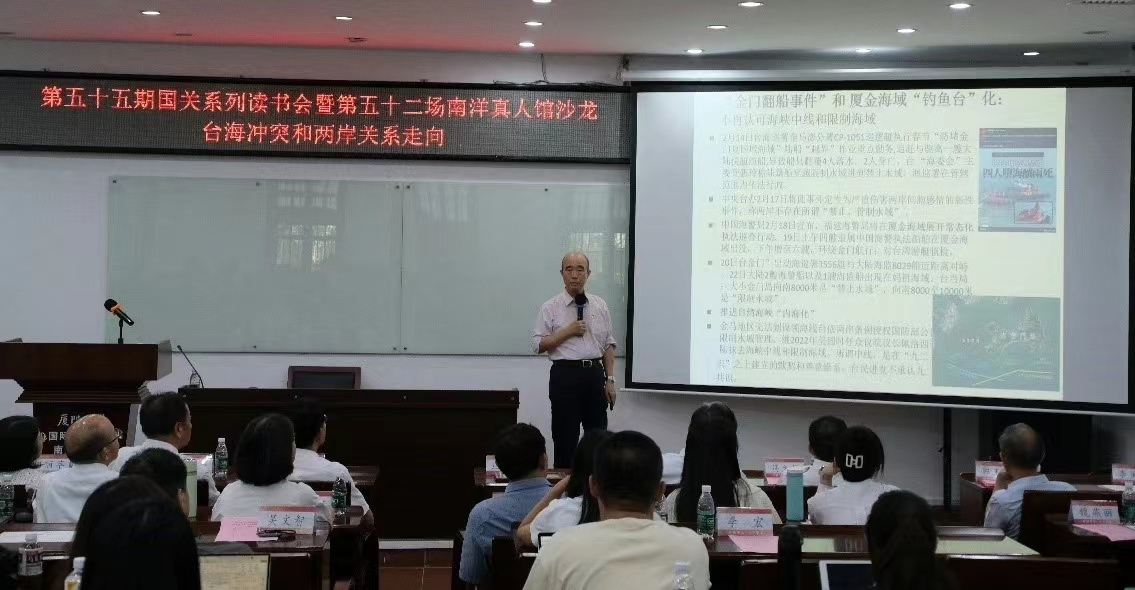 烈日炎炎,蝉声阵阵。书声琅琅,辩才无碍。7月2日下午,第五十五期国关系列读书会暨第五十二场南洋真人馆沙龙在厦门大学南安楼101报告厅举行。本次读书会的主题是“台海冲突和两岸关系走向”,知名海外华人研究和东南亚研究专家、厦门大学国际关系学院/南洋研究院特聘教授庄国土担任主讲人,厦门大学国际关系学院/南洋研究院党委副书记何丽苹担任主持人。