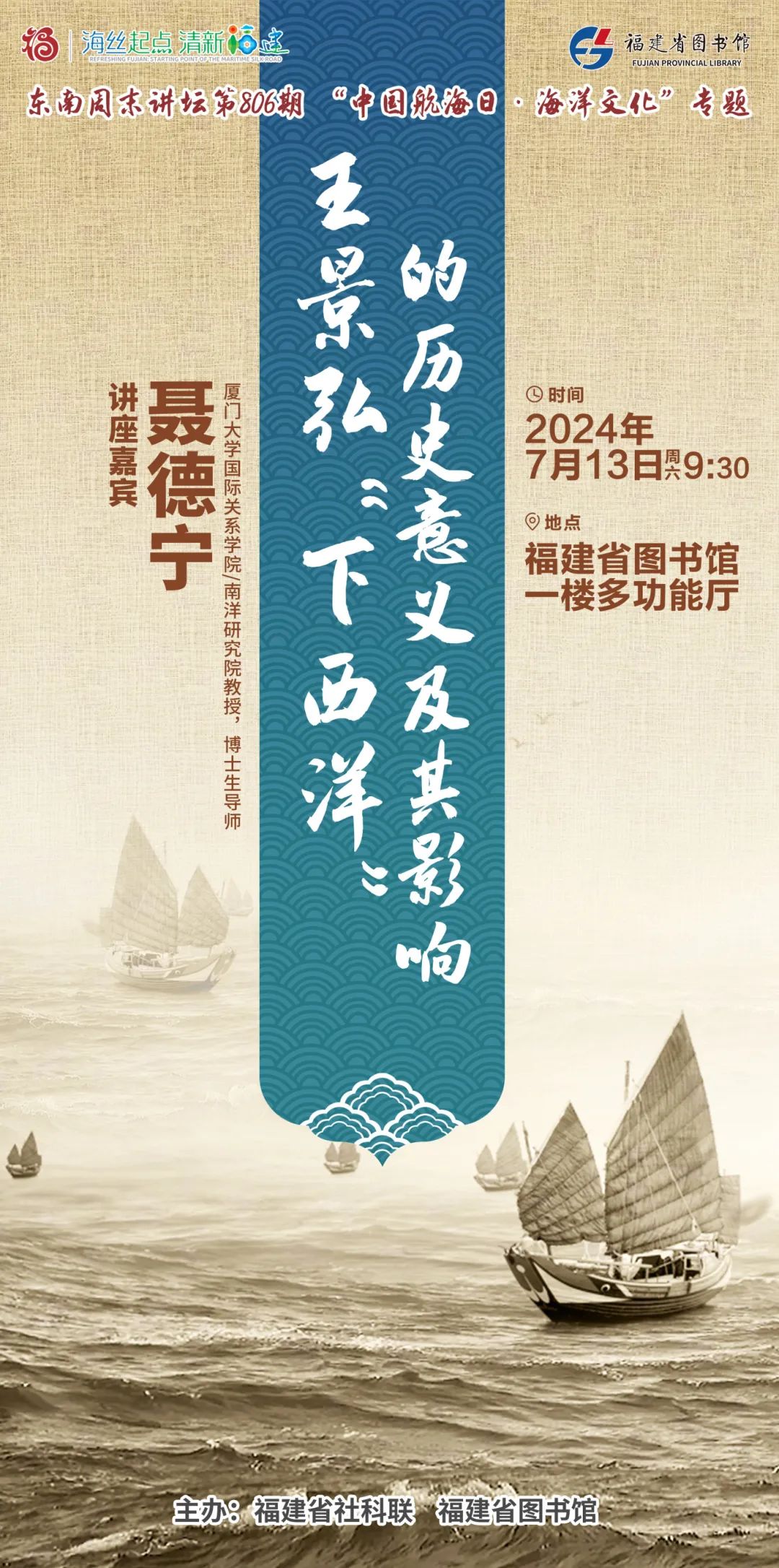 2024年7月13日,厦门大学国际关系学院/南洋研究院教授、博士生导师聂德宁在福建省图书馆做了题为“王景弘‘下西洋’的历史意义及其影响”的海洋文化专题讲座,带领读者走近明代航海家、外交家王景弘,从中国海洋发展史、中外关系发展史、海外移民发展史等多个史学角度,深入分析“下西洋”活动的深远影响。讲座由福建省社科联、福建省图书馆联合主办,温泉街道汤门社区协办,现场吸引老少读者、辖区人才等百余人前来聆听。请点击以下网址浏览东南网报道:https://www.toutiao.com/article/7391136685528007207/