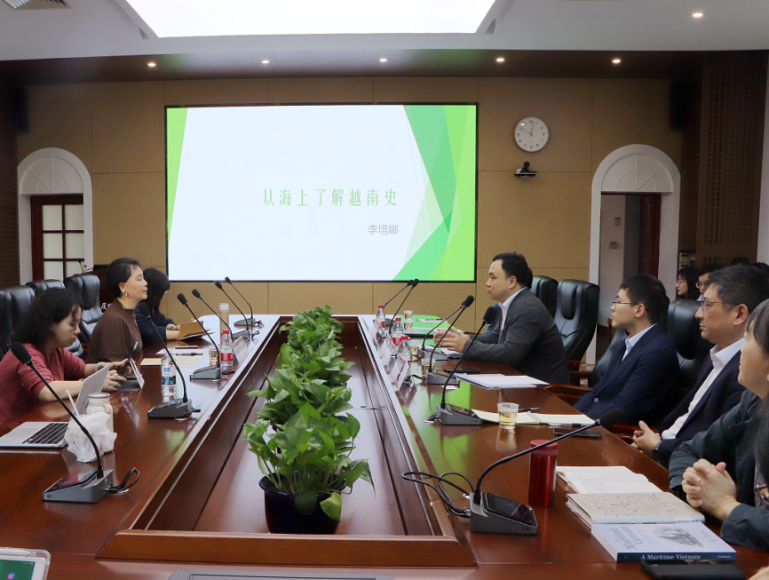 李教授首先向与会师生分时段介绍了越南历史演变的内部驱动力和外部驱动力。李教授首先从对黎圣宗和越南军事结构的分析开始,引出对越南与整个东南亚相互互动环节的整体分析,总体来说,越南在历史上受到的外部各方面的影响和越南内部的推动相结合促进了越南的历史演变,她认为要通过海洋了解越南历史的深层结构,跨学科的研究也非常重要。
