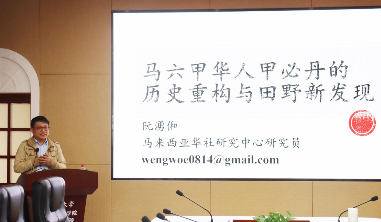 在讲座中,阮湧俰博士主要讲述了其在华人社会及马六甲地区的研究经历和成果。他通过分享如何在田野调查中通过挖掘族谱、碑文及地方档案,逐步揭示出关于华人社会组织、司法和军事体系的历史脉络。