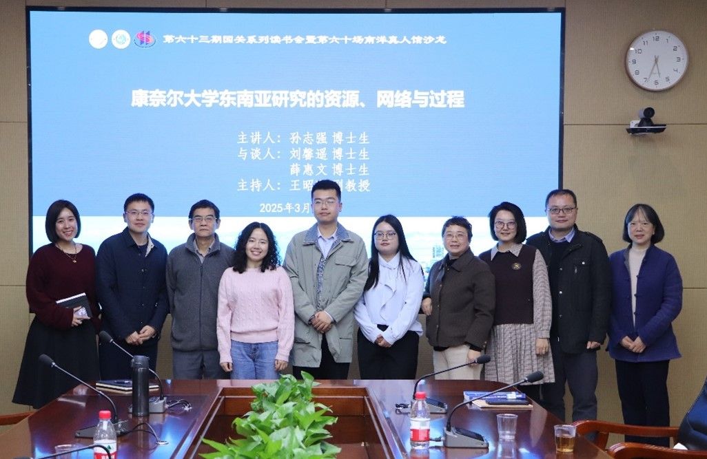 2025年3月10日下午,春日的暖阳轻抚大地,万物复苏,厦门大学南安楼301-3会议室迎来了一场学术盛宴——第六十三期国关系列读书会暨第六十场南洋真人馆沙龙,讲座的主题为“康奈尔大学东南亚研究的资源、网络与过程”。复旦大学国际政治系2022级博士研究生孙志强担任主讲人,他带着在康奈尔大学的访学感悟,跨越山川湖海,回到母院,与师生们相聚。两位与谈人是厦门大学国际关系学院/南洋研究院2022级世界史专业博士研究生刘馨遥和2023级世界史专业博士研究生薛惠文,厦门大学国际关系学院/南洋研究院副教授王昭晖担任主持人。