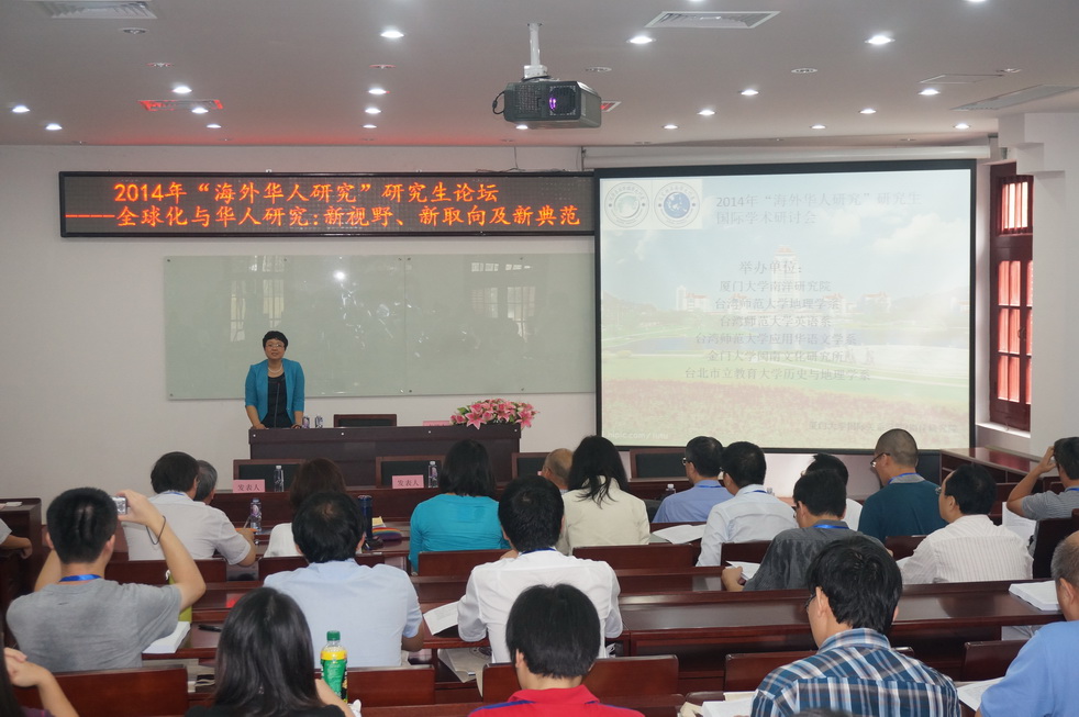 2014年9月20日至21日,“海外华人研究”研究生论坛在厦门大学南安楼举行。本次论坛由厦门大学南洋研究院、台湾师范大学、台北市立教育大学以及金门大学联合举办,论坛主题是“全球化与华人研究、新视野、新取向及新典范”,来自海峡两岸专家学者及研究生共60多人参加了此次论坛。