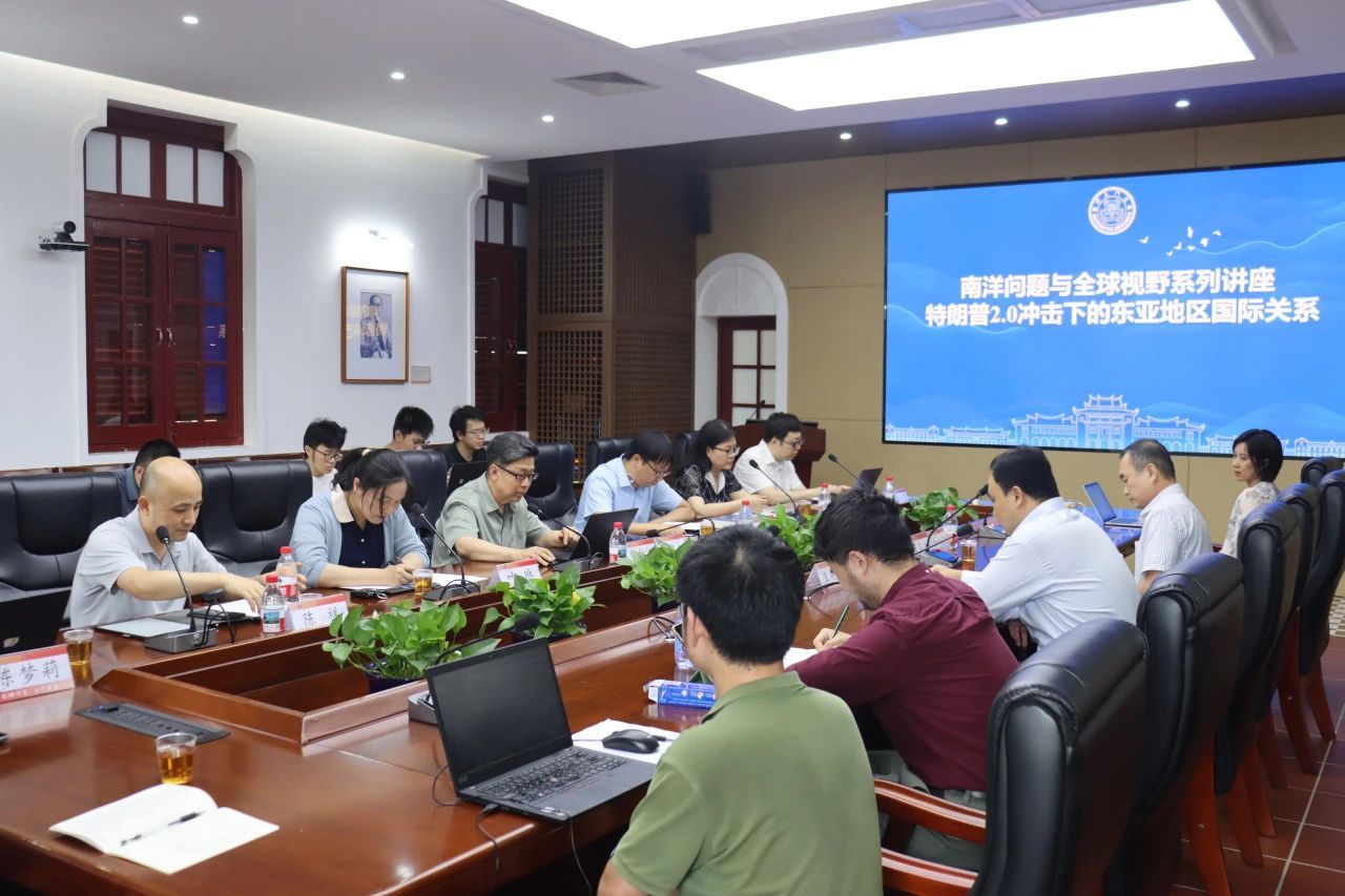2025年6月12日下午,“南洋问题与全球视野系列”讲座第七十八讲在厦门大学南安楼301-3会议室举行。本次讲座特邀中国社会科学院日本研究所所长、党委副书记、研究员杨伯江教授担任主讲人,主题为“特朗普2.0冲击下的东亚地区国际关系”。
