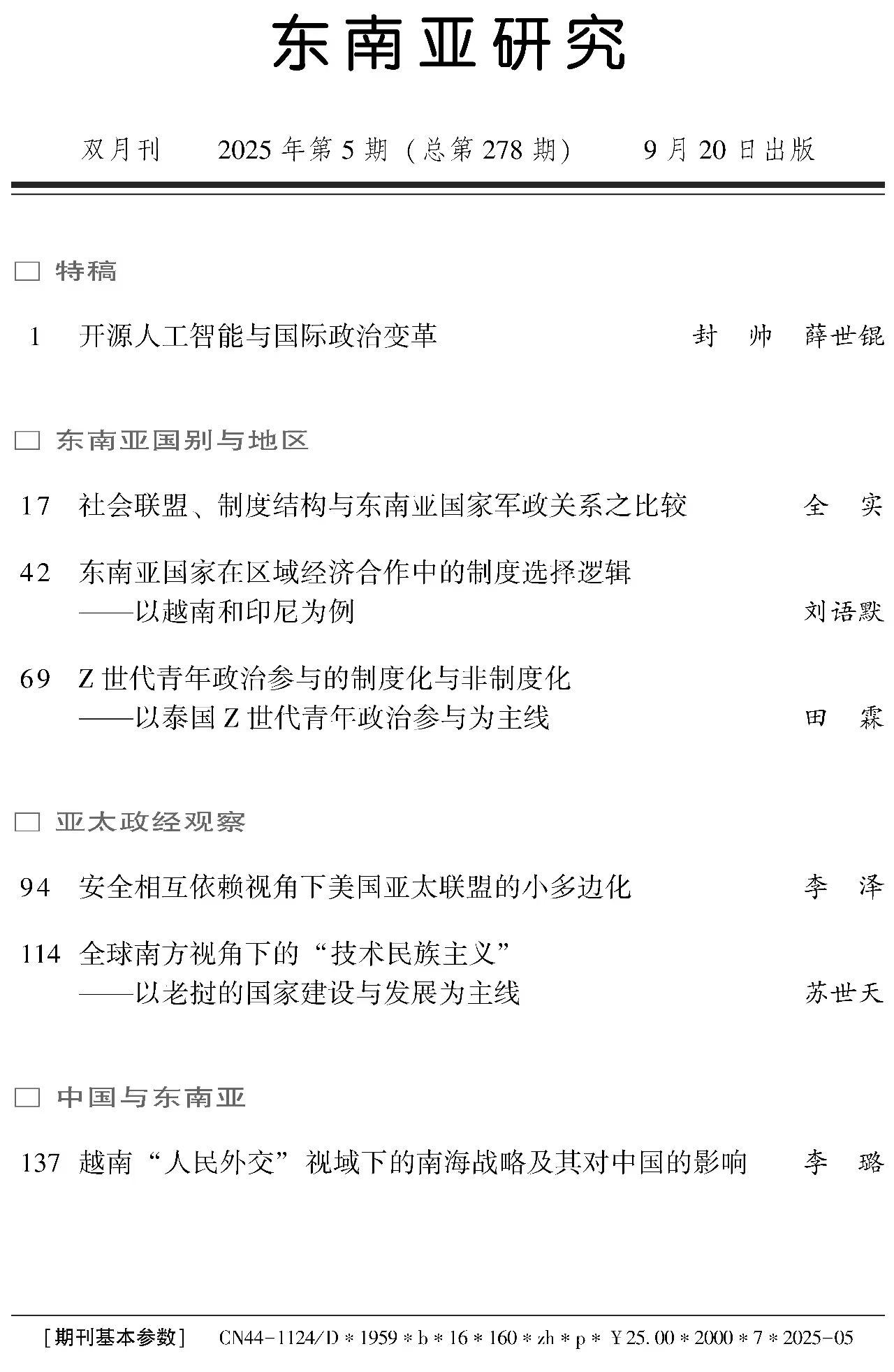 厦门大学国际关系学院/南洋研究院助理教授苏世天新作《全球南方视角下的“技术民族主义”——以老挝的国家建设与发展为主线》在《东南亚研究》2025年第5期正式刊出,全文详见https://mp.weixin.qq.com/s/LuFhqIgi1pjt7bySCrGSYA?scene=25&sessionid=&click_id=13#wechat_redirect