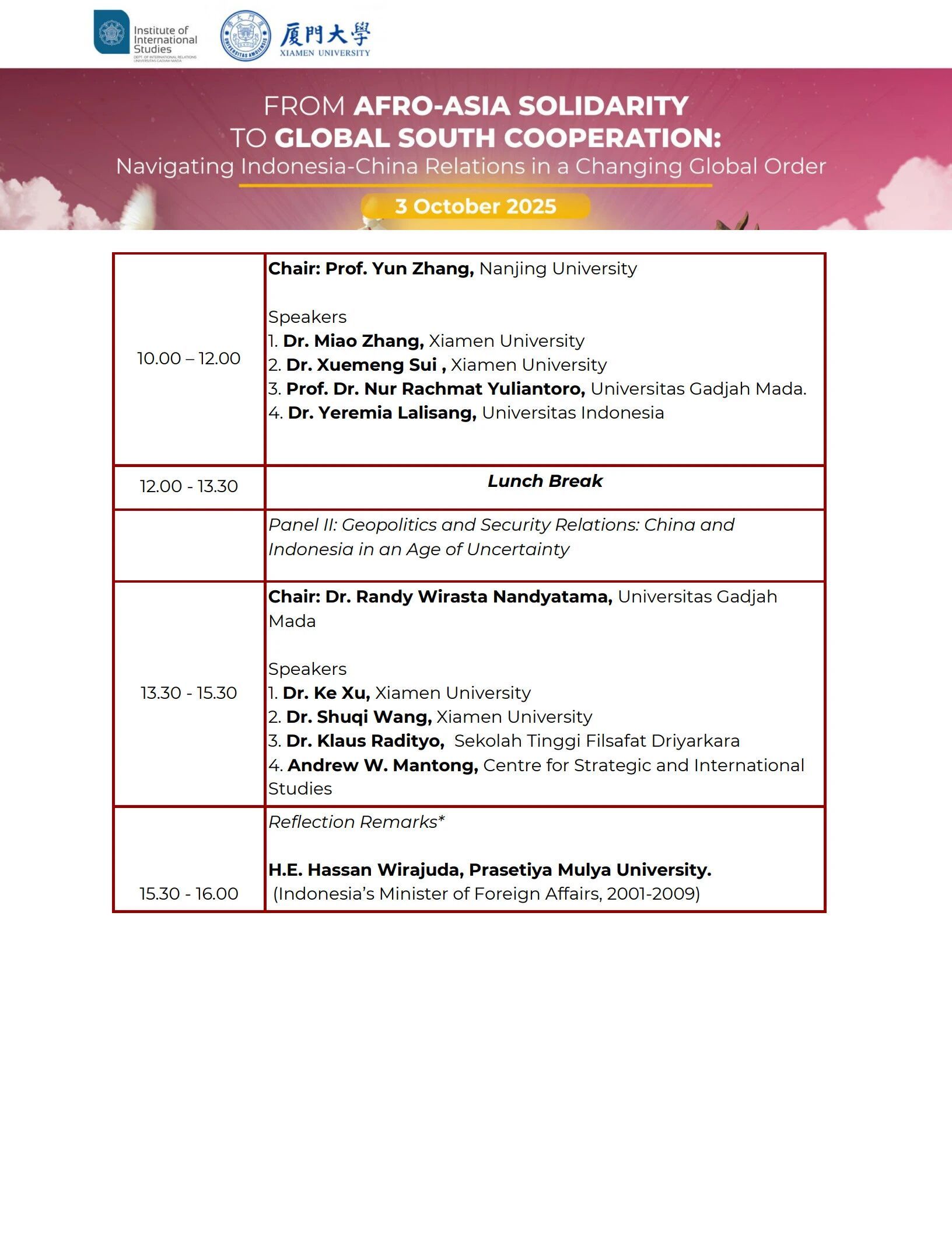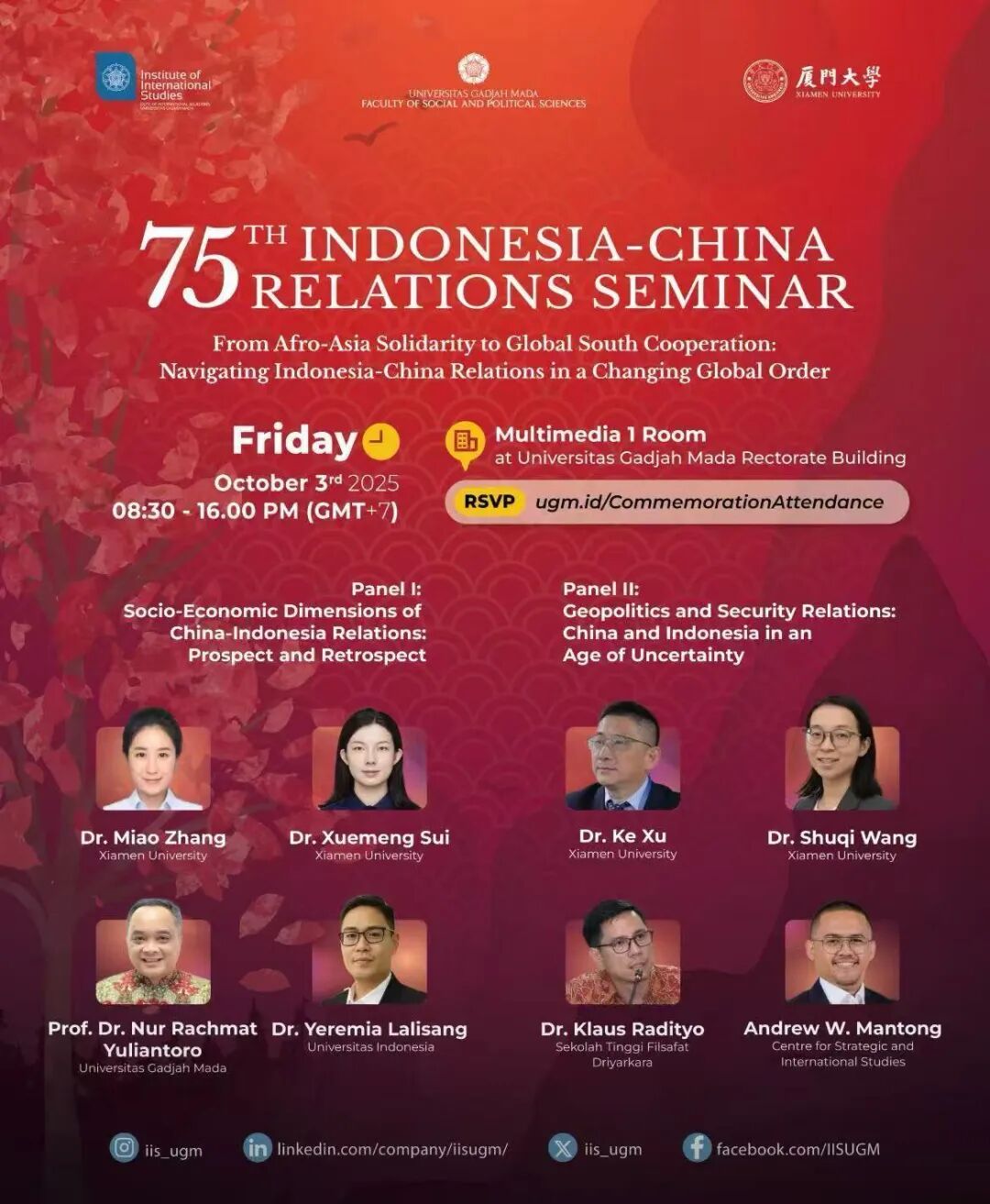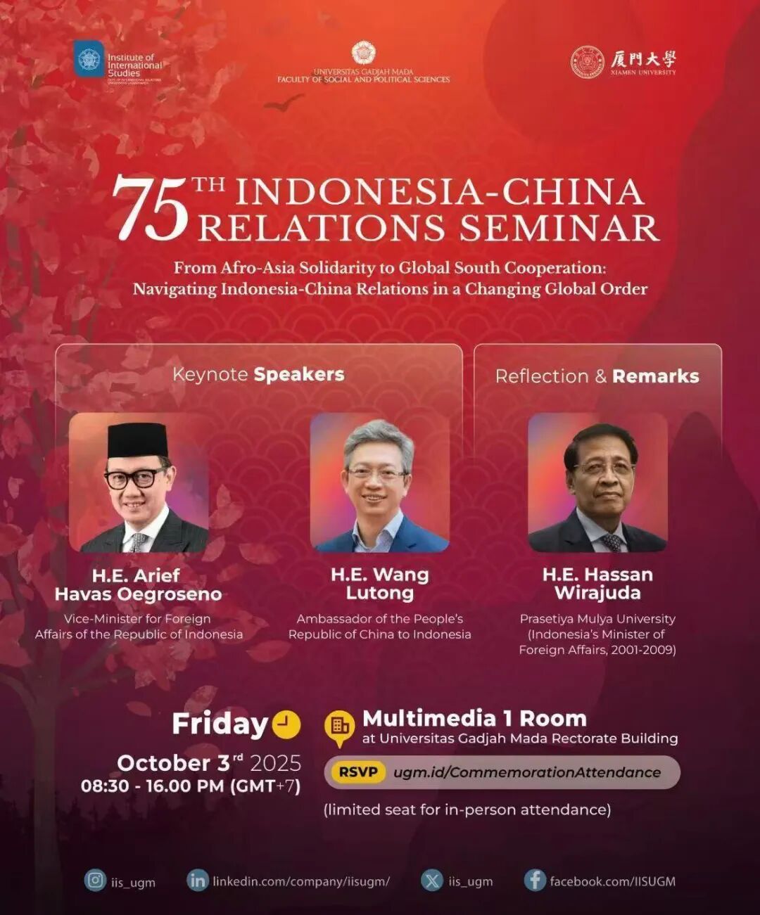 2025年10月3日,为纪念中华人民共和国与印度尼西亚共和国建交75周年,厦门大学国际关系学院/南洋研究院与印度尼西亚加查马达大学社会与政治科学学院将联合举办“中印尼关系:回顾与前瞻”高级别学术研讨会。本次研讨会在印尼日惹举行,主题为“从亚非团结到全球南方合作:变革全球秩序中的中印尼关系”,旨在深入梳理两国自上世纪50年代以来从后殖民团结走向全面战略伙伴关系的发展历程,聚焦新形势下双边合作面临的机遇与挑战,并为未来三十年两国关系的健康发展提供学术支持和政策参考。中国驻印尼特命全权大使王鲁彤、印尼外交部副部长阿里夫·哈瓦斯将出席研讨会并发表演讲。