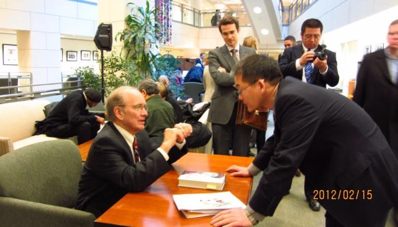 图为夏亚峰教授与耶鲁大学教授约翰·加迪斯(John Gaddis)沟通交流