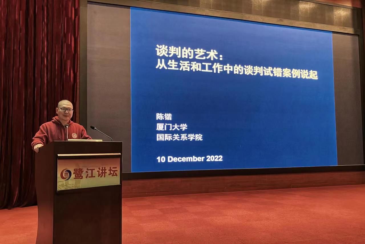 2022年12月10日上午,我院教师陈锴博士作为“鹭江讲坛”报告人,在厦门市图书馆集美新城馆区一楼报告厅做《谈判的艺术——从生活和工作中的谈判试错案例说起》专题讲座。
