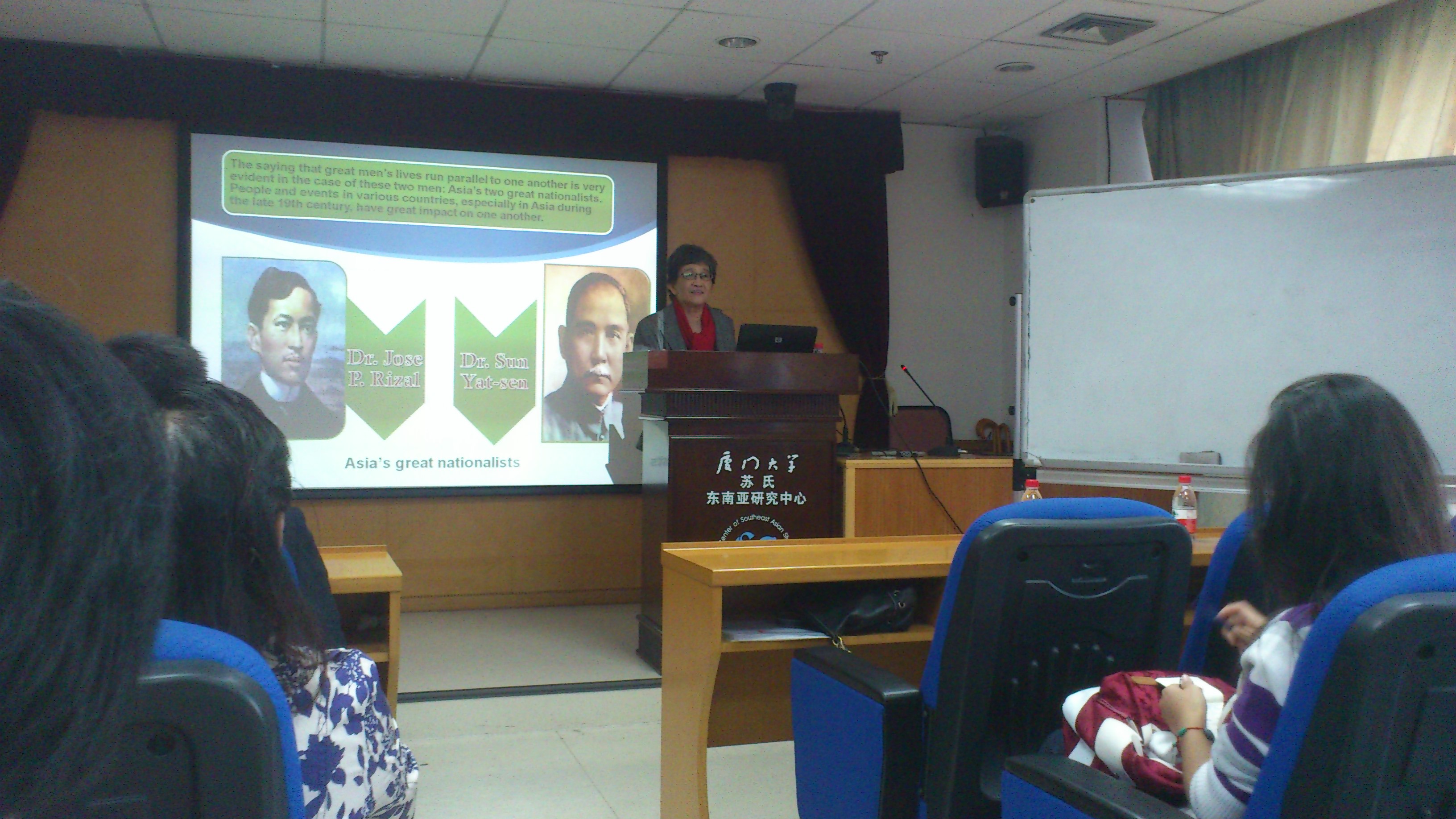 2011年11月30日星期三上午9点,菲律宾华裔青年联合会主席洪玉华女士(TeresitaAng See)在嘉三514进行了一场名为《革命烈焰——同根相连》(the fire of revolution : ties that bind)的讲座。
