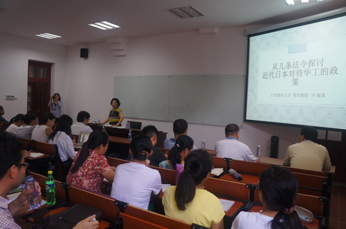 许淑真教授现任摄南大学荣誉教授,在她的题为《近代日本政府对待华侨的政策-以几个涉侨法令为例》的讲座中,许教授以几个近代以来日本政府陆续出台的对待在日华侨的法令为案例,简明扼要地回顾了近代日本政府对待华侨的政策及其影响。紧接着,来自日本东京大学的谷垣真理子副教授在《华南社会的特点和香港政治与社会》的讲座中与大家分享了她对于中国华南社会以及香港社会的研究成果。她不仅介绍了地域文化研究的研究方法,还给大家简要地介绍了香港的概况、强调了历史上香港对于亚洲的重要性,最后通过分析香港的政治与社会,得出了关于什么是华南社会特点的结论。虽然谷垣真理子副教授是地道的日本人,但讲座中她熟练的中文令现场的听众拍手称赞。最后,来自亚细亚大学的容应萸教授以身说法,她以自己家族即广东关元昌家族的世代迁移为例,通过许多不同年代家族团聚时的照片,生动地为大家展示了随着时代的变迁,一个中国大家族的国际迁移状况。