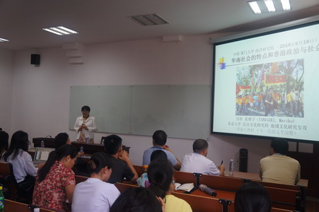 2014年9月19日下午15:00,许淑真教授、谷垣真理子副教授与容应萸教授一行三人,在厦门大学本部南安楼203教室,分别为厦门大学国际关系学院暨南洋研究院的师生们带来了题为《近代日本政府对待华侨的政策-以几个涉侨法令为例》、《华南社会的特点和香港政治与社会》、《华人家族的国际移动-广东关元昌一族的个案研究》三场讲座。国际关系暨南洋研究院院长庄国土、副院长施雪琴、国际关系系主任赵海立、副主任张旭东等领导出席本次讲座。三场讲座均由施雪琴副院长主持。