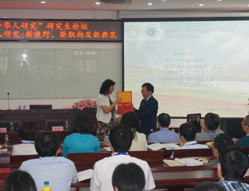 9月20日上午,2014年海外华人研究生论坛开幕式在厦门大学南洋研究院南安楼学术报告厅举行,厦门大学南洋研究院副院长施雪琴教授致欢迎辞。施教授对积极参与和支持本次论坛的广大师生表示诚挚欢迎,对厦门大学公共管理学院、人文学院、外文学院对本次论坛的支持表示感谢。之后,台湾海华会与厦门大学南洋研究院互赠纪念品。