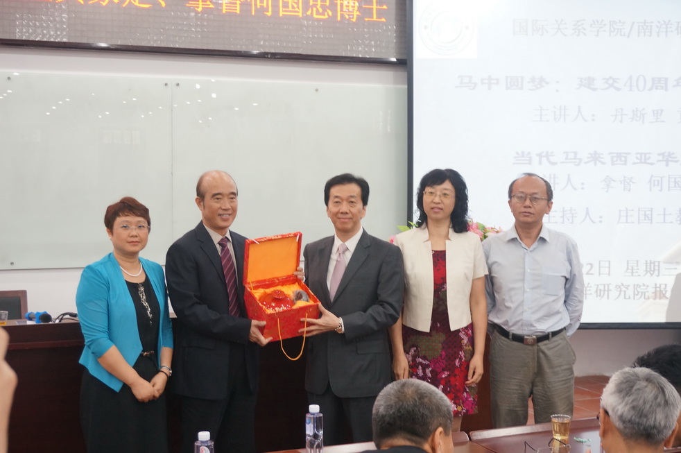 最后,丹斯里黄家定主席及拿督何国忠教授接受了厦门大学国际关系学院/南洋研究院客座教授的续聘,厦门大学国际关系学院/南洋研究院向两位客座教授赠送了礼品,两位教授则向厦门大学国际关系学院/南洋研究院赠送了习近平主席对马来西亚国事访问及马来西亚首相纳吉布访华的纪念画册。本次专家论坛在热烈的掌声中圆满落下帷幕。