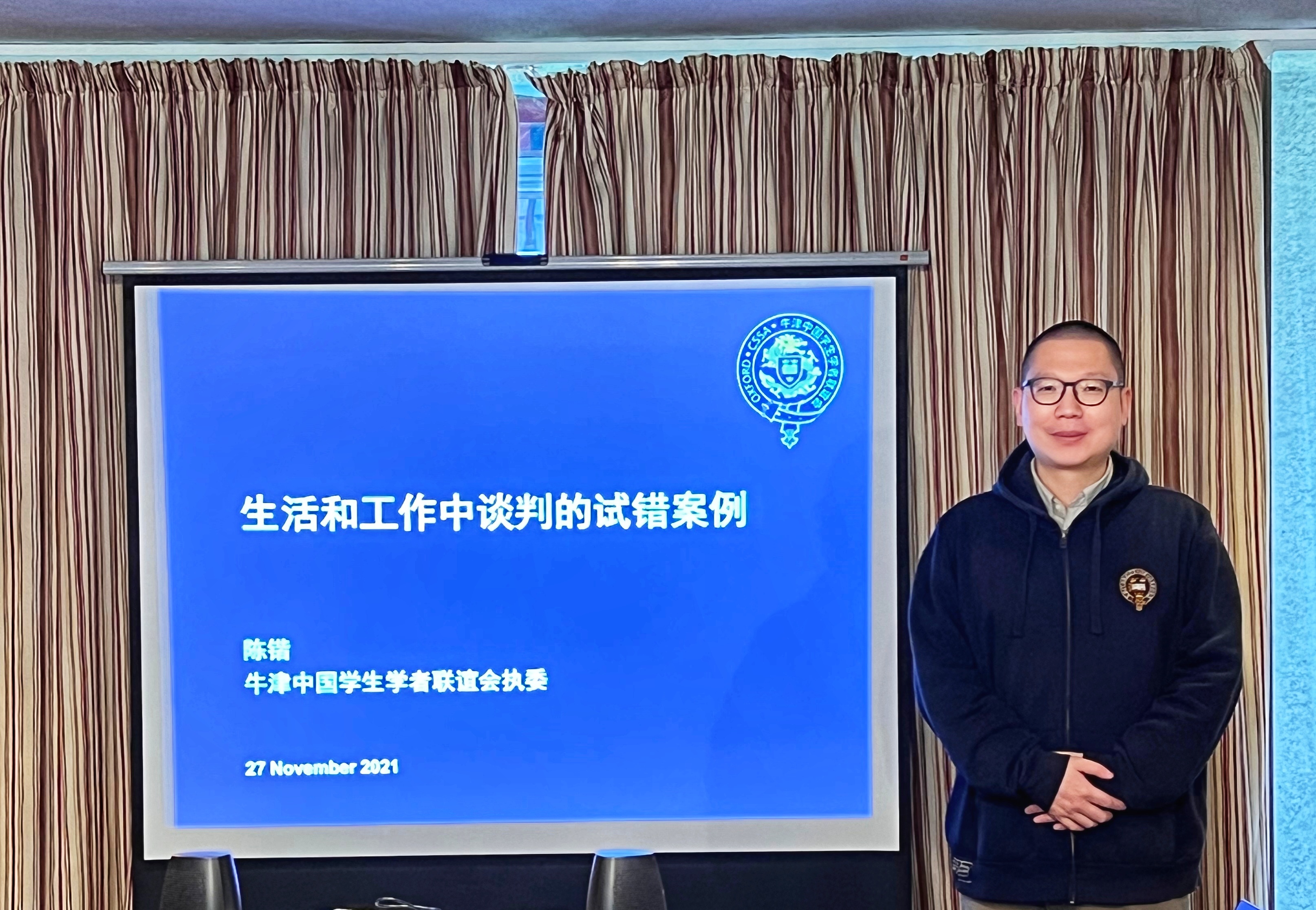 2021年11月27日下午,学院助理教授陈锴博士在牛津大学圣约翰学院作题为“生活和工作中谈判的试错案例”的讲座。