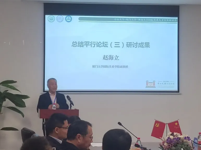 本次“中山大学-厦门大学-暨南大学国际关系人才培养研讨会”的最后,暨南大学国际关系学院吴金平教授、中山大学国际关系学院唐睿教授以及我院赵海立副教授分别对三个平行论坛的内容与成果进行了总结。