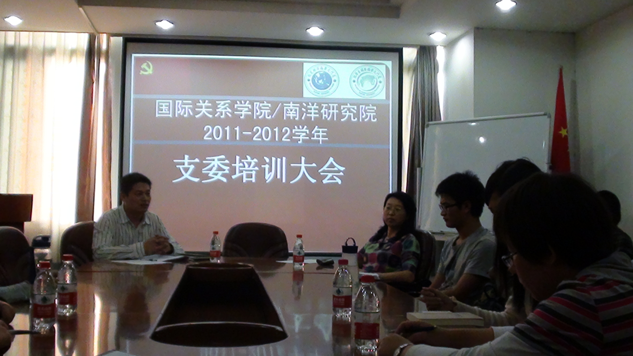 为贯彻党的十七大和十七届四中、五中、六中全会精神,结合深入开展创先争优活动,加强学院党建工作,,国际关系学院/南洋研究院2011年度的学生党支部支委培训班于嘉庚3-1036室顺利开班。开班仪式由院党总支副书记黄俊清主持,院党总支书记范丽、团委书记沈丽秀、党务秘书姚晓静及各学生党支部支委成员到会参加。