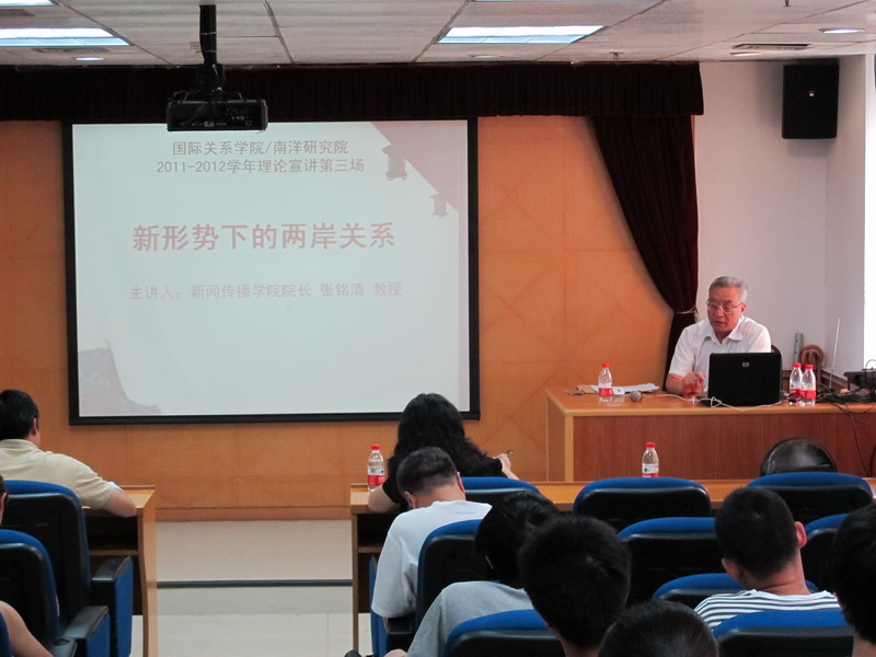 国际关系学院/南洋研究院党总支于下午3:30,嘉三514室开展2011年-2012年第三场理论宣讲。我院有幸请到了新闻传播学院院长张铭清教授,主讲了题为《新形势下的两岸关系》的讲座。我院广大师生参加了这次宣讲。
