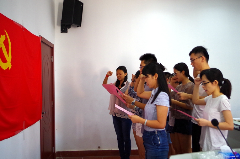 “我为党旗添光彩”,在辅导员郭晓玲的领誓下,全体新党员面对鲜红的党旗,庄重宣誓:“我志愿加入中国共产党,拥护党的纲领,遵守党的章程……随时准备为党和人民牺牲一切,永不叛党。”一字一句铭记在每个新党员的心中,作为新党员,他们深知自己身上的责任重大,也将通过实际行动证明今天在党旗前许下的承诺。在新党员的宣誓声中,与会的其他党员重温入党誓词,进一步坚定了身为中共党员的责任与使命,不忘初心,继续前行。