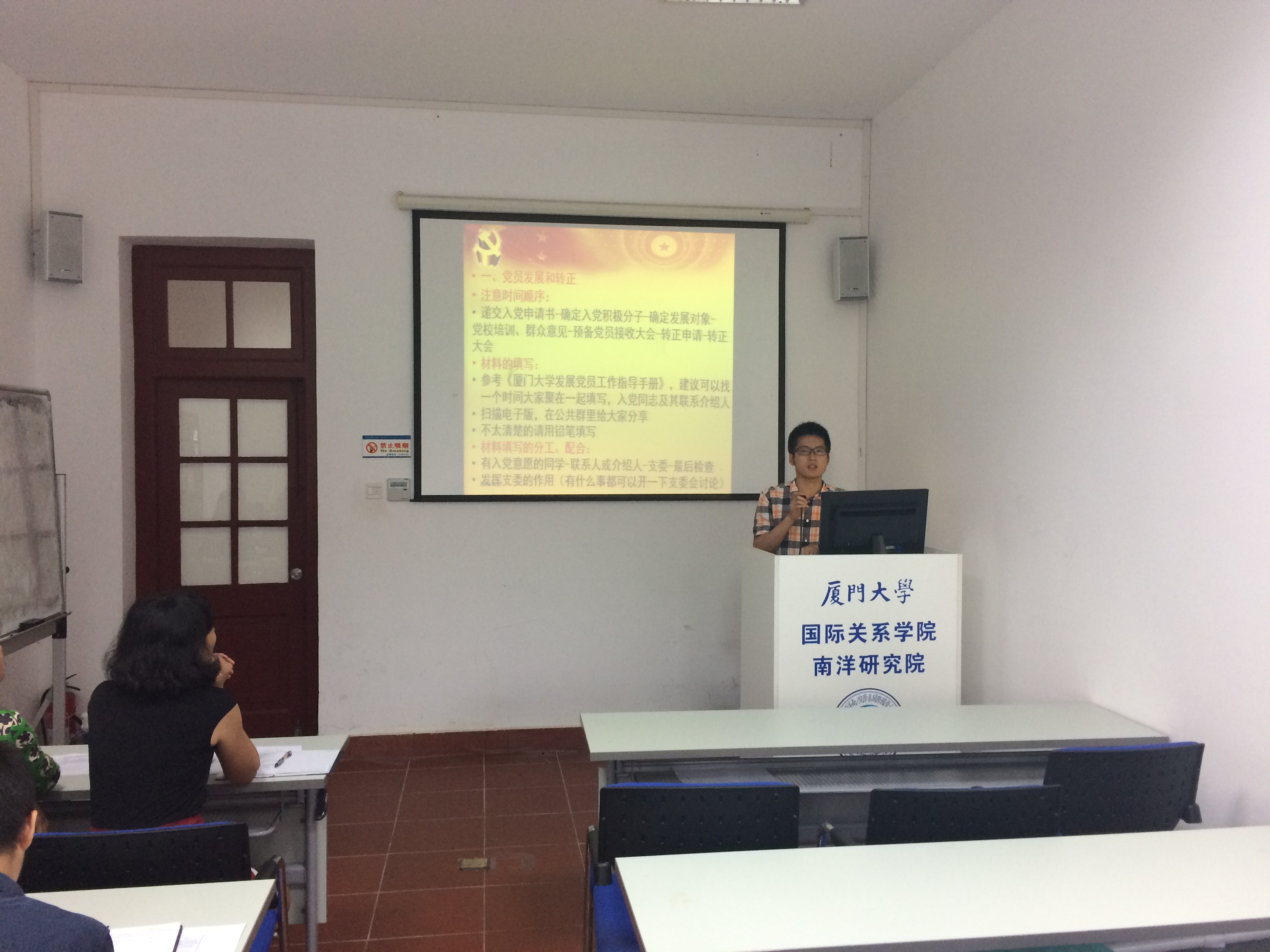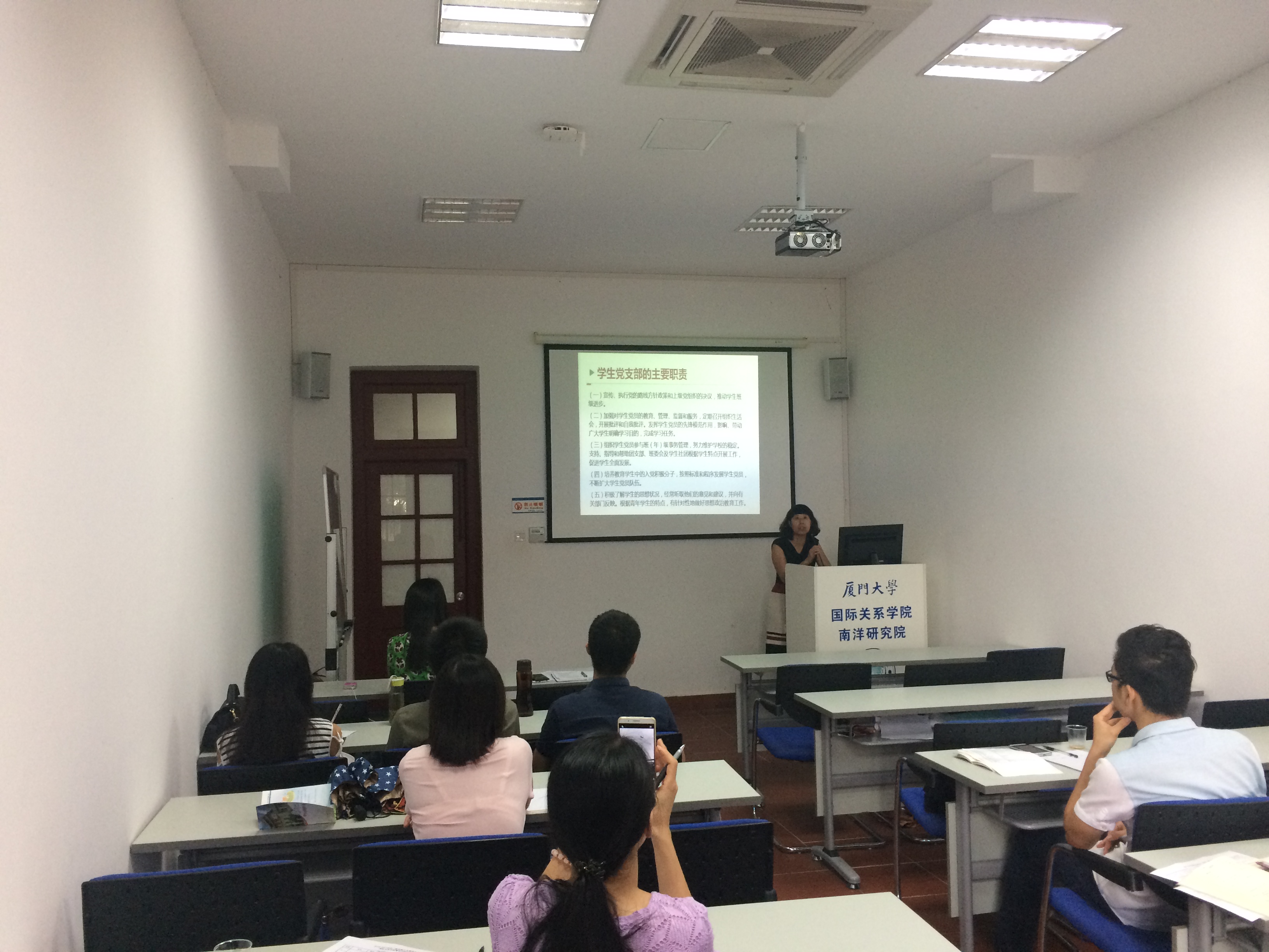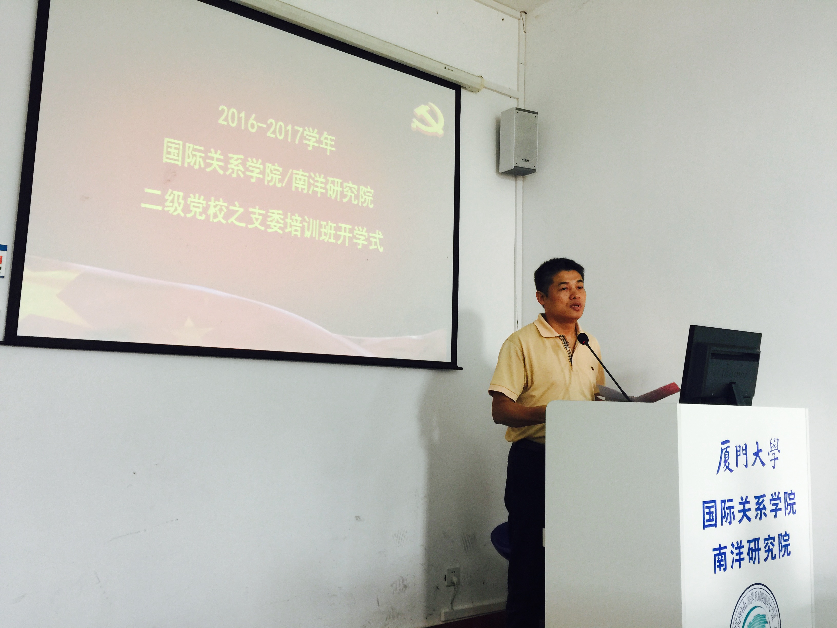 2016年10月27日下午15:00,2016-2017学年厦门大学国际关系学院暨南洋研究院二级党校之支委培训班开学式暨第一次学习在南安楼107正式举行。开学式由院党委副书记黄俊清主持,院党委书记范丽、团委书记沈丽秀、党务秘书曾祥轩、辅导员郭晓玲及各学生党支部支委成员到会参加。