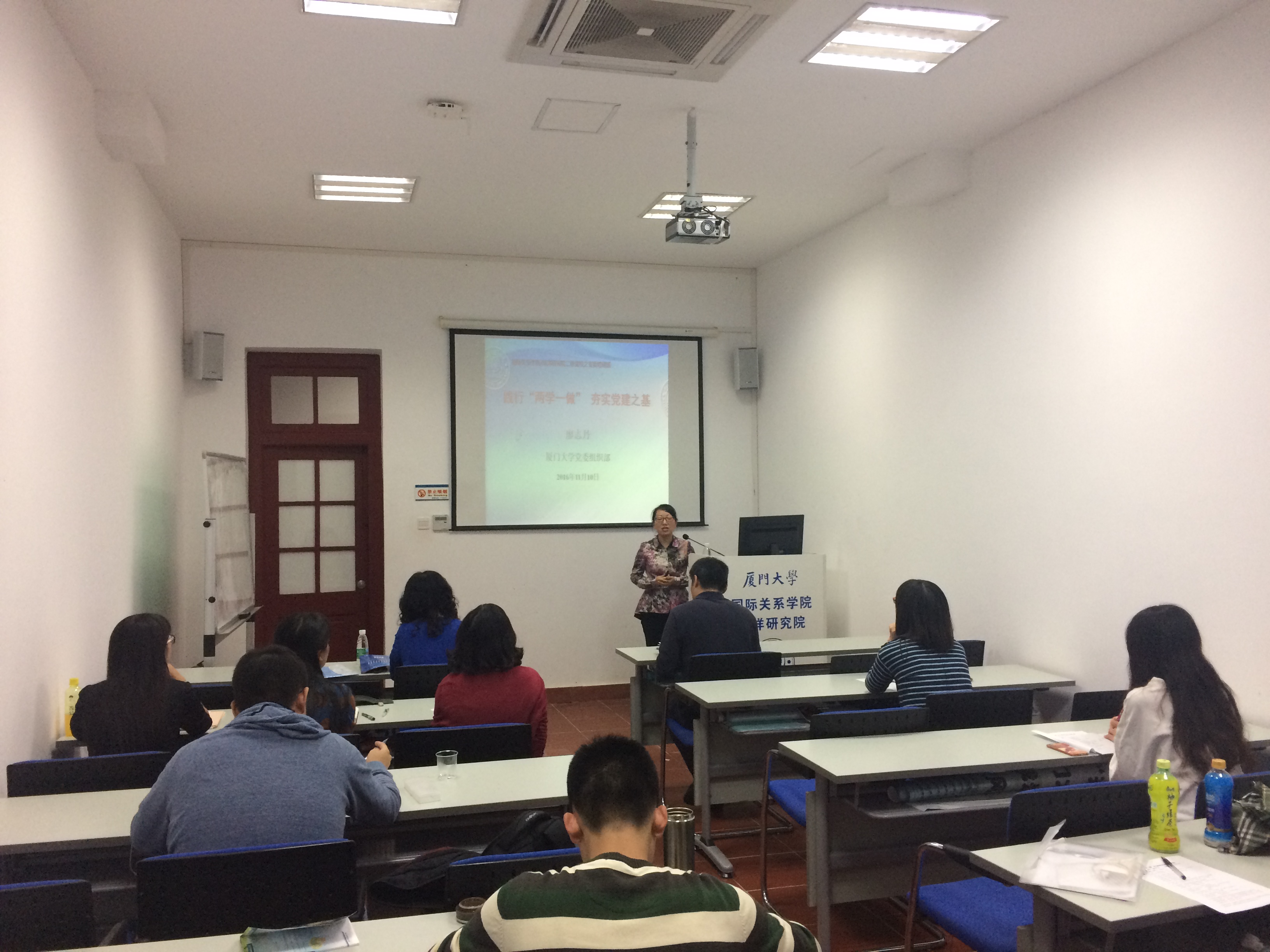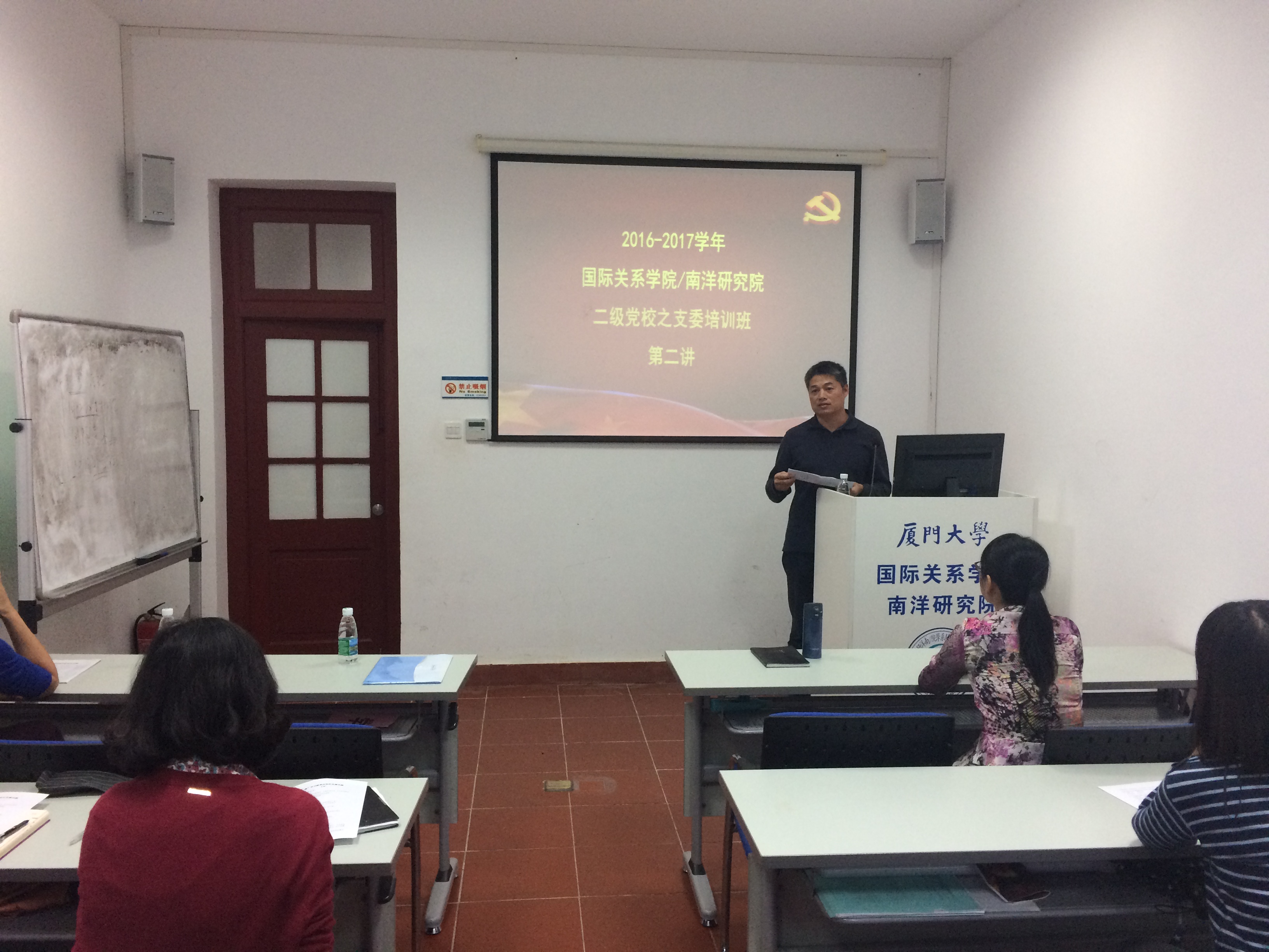 2016年11月10日下午16时,2016-2017学年厦门大学国际关系学院暨南洋研究院二级党校之支委培训班第二次学习在南安楼107正式举行。学习会由院党委副书记黄俊清主持,学校组织部副部长廖志丹做题为《践行“两学一做” 夯实党建之基》的主题报告,院党委书记范丽、团委书记沈丽秀、辅导员郭晓玲及各学生党支部支委成员到会参加。