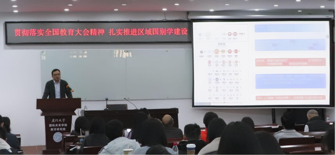 为深入学习贯彻全国教育大会精神,扎实推进区域国别学建设,12月9日,国际关系学院/南洋研究院党委在南安楼举行专题教学。学院院长高艳杰教授作为主讲人作题为“贯彻落实全国教育大会精神,扎实推进区域国别学建设”的专题党课。此次党课以“主课堂+分课堂”相结合的方式进行,全院师生党员以及本期“红心向党”成长营的学生新发展党员、学生入党积极分子学员参加。专题党课由院党委书记邱旺土主持。