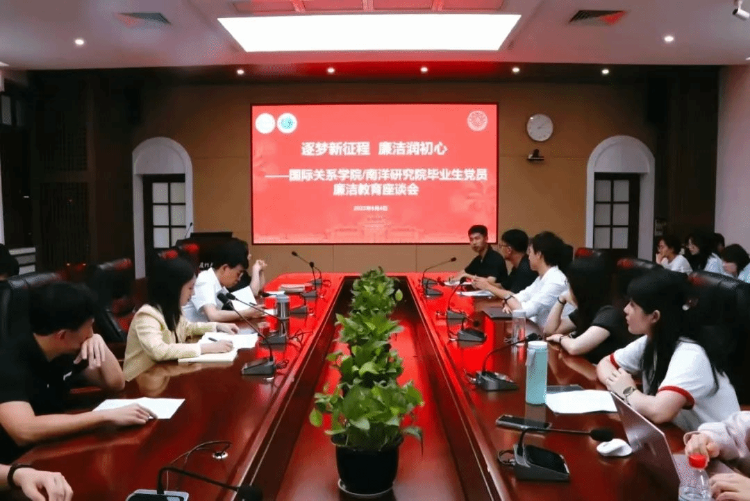 2025年6月4日下午,国际关系学院/南洋研究院在南安楼301-3举办2025届毕业生党员廉洁教育座谈会。学院党委书记邱旺土,党委副书记何丽苹及2025届毕业生党员参加座谈会,会议由院团委书记肖丽玮主持。