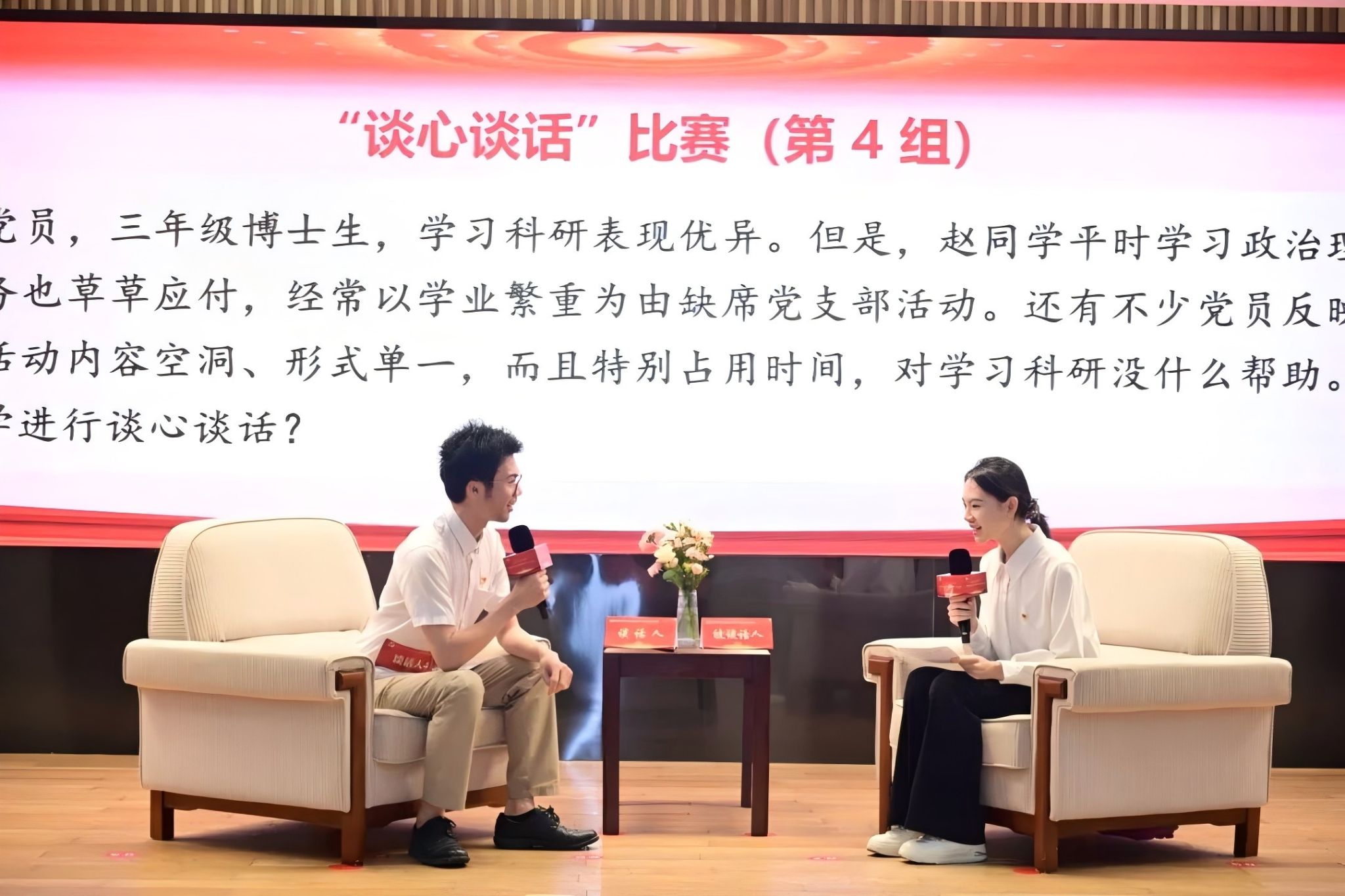 本次大赛围绕“建设教育强国”主题,设置党务知识竞赛、“主题党日策划”和“专题微党课”环节以及谈心谈话多个赛项,考验参赛队伍运用理论解决实际问题的能力。学院党委选派教工党支部书记王付兵副教授,党务秘书朱鸿婕,学生党支部书记刘佳宜组队参赛。参赛选手结合AI动画,图片史料,情景模拟,在各轮比赛中展现学院师生在立德树人、科研攻坚、党务工作中依托学科优势紧密对接国家战略需求的担当作为。