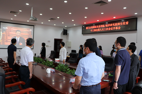 十三届全国人大三次会议于22日上午9时在人民大会堂开幕,习近平等党和国家领导人出席开幕会,国务院总理李克强向大会作政府工作报告。厦门大学国际关系学院/南洋研究院党政领导、行政教工党支部、在职教师党支部及部分党员学生在南安楼301(3)会议室集中收看开幕会,深刻学习领会两会精神。