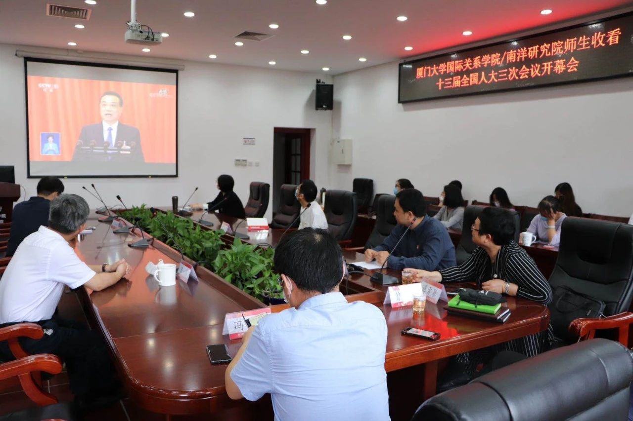 2020年5月22日上午9时,人民大会堂进行了十三届全国人大三次会议开幕会,除了厦门大学国际关系学院/南洋研究院党政领导、行政教工党支部、在职教师党支部外,部分已返校的党员学生也在南安楼301(1)会议室集中收看。国关南洋未返校的莘莘学子也在家中密切关注着两会的动态,并按时收看两会以来的直播。