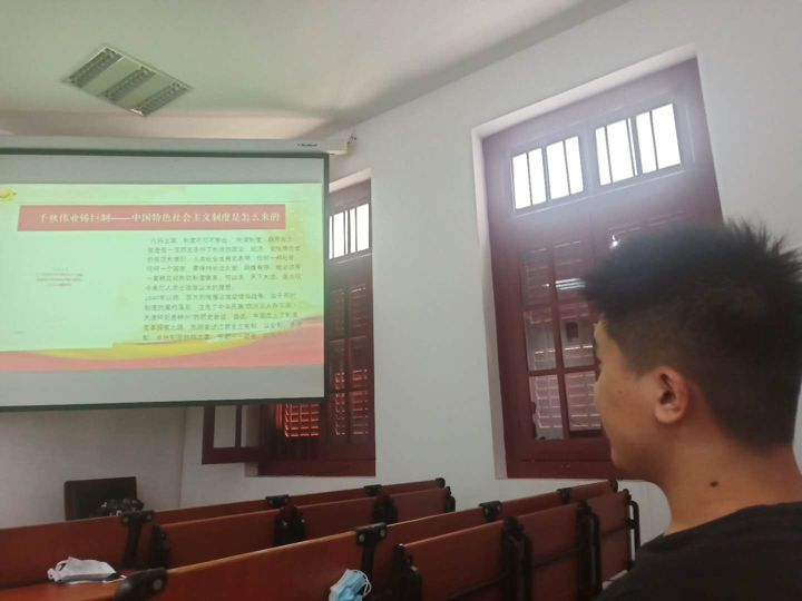 “‘人间正道是沧桑’ 中国特色社会主义制度,不是从天上掉下来的,而是从理论到实践的反复探索、历尽千辛万苦形成的,是中国人民在艰难中摸索、在坚守中创新的壮丽史诗。”杨健斐同学在主题党日开始时庄重的说道。