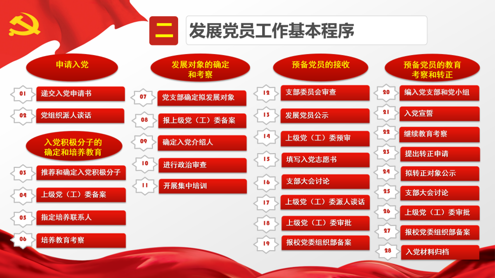 以时间为轴,郭晓玲详细说明发展党员工作的五大基本程序。第一阶段,申请入党;第二阶段,入党积极分子的确定和培养;第三阶段,发展对象的确定和考察;第四阶段,预备党员的接受;第五阶段,预备党员的教育、考察和转正。