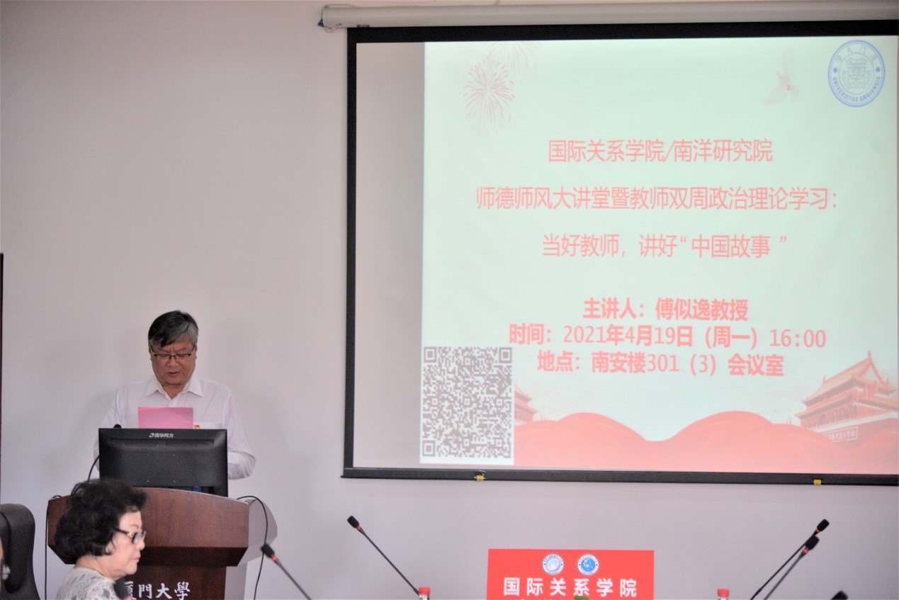 4月19日下午,“福建省教学名师”、厦门大学外文学院傅似逸教授为学院全体教师带来一场别开生面的讲座——“当好老师,讲好‘中国故事’”。讲座由学院党委书记毛通文老师主持。