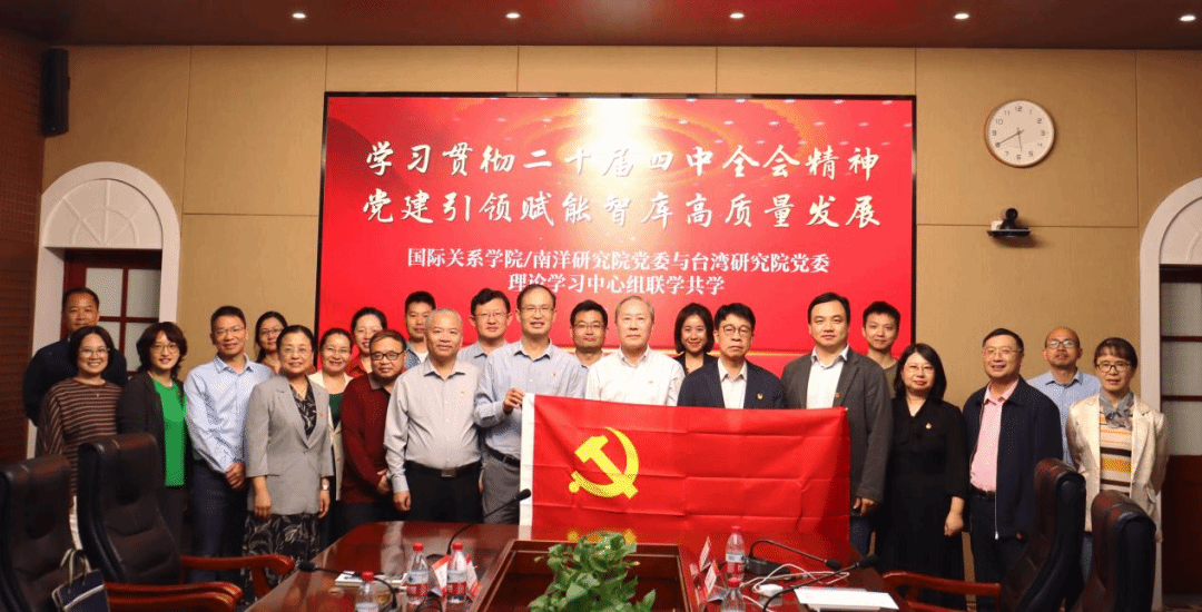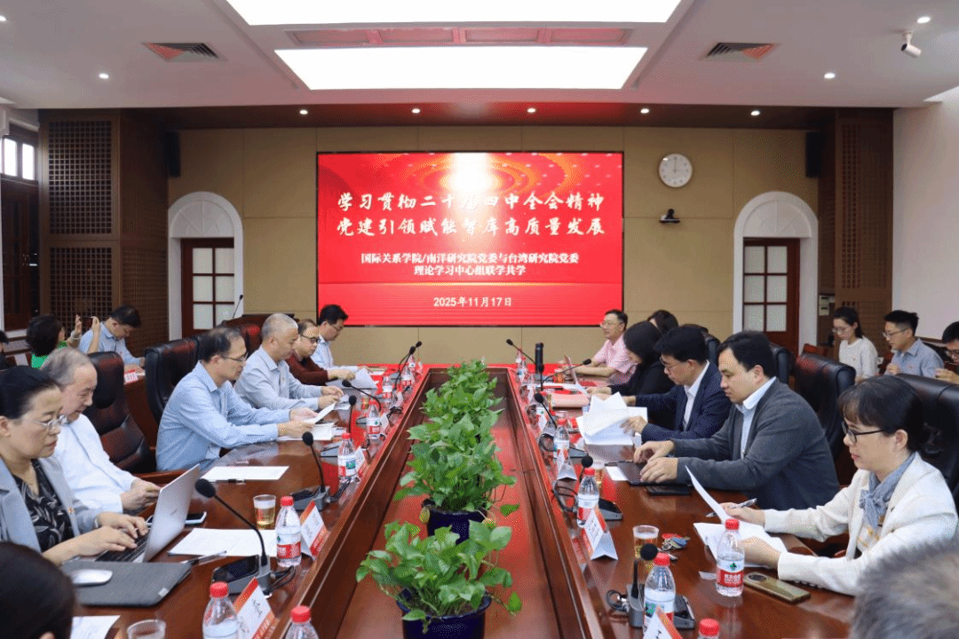 党的二十届四中全会为新时代推进国家治理体系和治理能力现代化作出了全面部署,也为高校智库立足国家战略、服务发展大局指明了前进方向。国际关系学院/南洋研究院与台湾研究院作为学校国际问题研究、对台涉台问题研究领域的重要智库阵地,肩负着为国家战略决策提供智力支撑、为两岸关系和平发展与区域合作贡献学术力量的重要使命。本次联学共学,以党建为纽带,搭建学科交流平台,旨在推动两院在理论学习中凝聚共识,在实践探讨中破解难题,切实把党建优势转化为智库发展优势。两院也将以此为契机,以中国东南海疆治理实验室为平台,探索新文科建设路径,推动有组织的科研,锚定国家需求,聚焦学科突破,乘势而上,以实际行动服务国家发展大局。