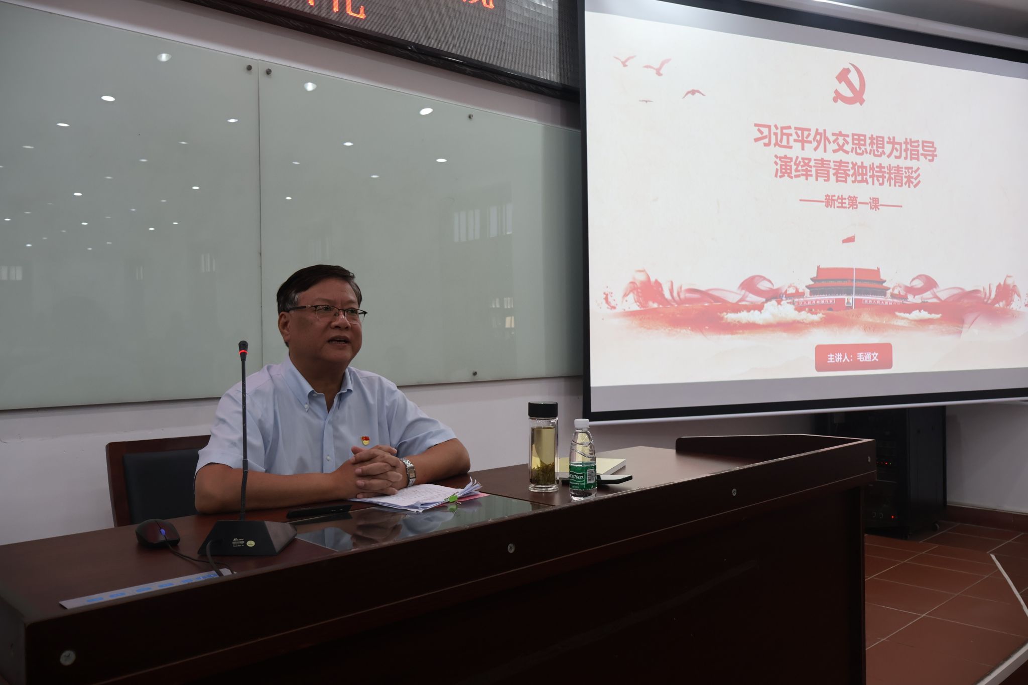2022年9月28日下午,国际关系学院/南洋研究院党委书记毛通文老师在南安楼101教室,以“习近平外交思想为指导演绎青春独特精彩”为题,为全体2022级新生讲授“开学第一课”。