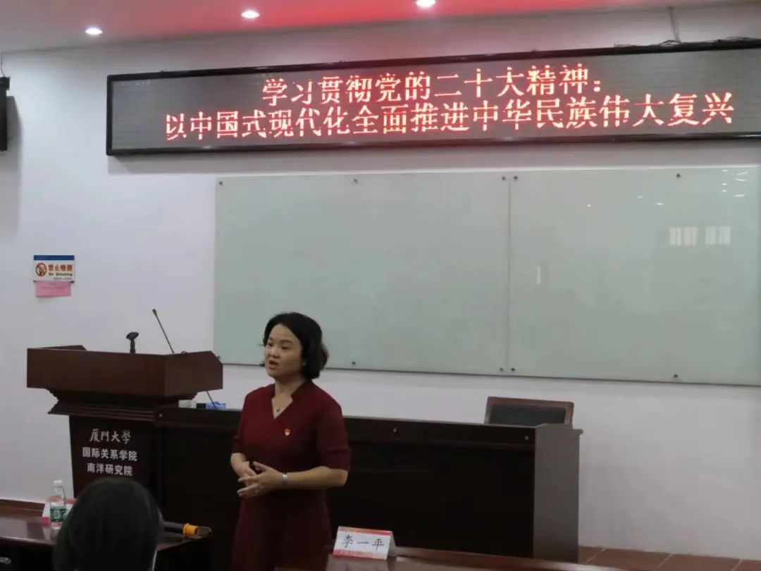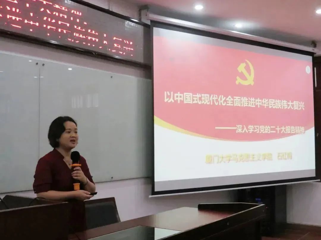 11月14日下午,学院组织了一场覆盖全院的院党委中心组(扩大)理论学习暨教师双周政治理论学习,理论学习以主题讲座形式开展,讲座主题为“以中国式现代化全面推进中华民族伟大复兴”。厦门大学马克思主义学院党委书记、博士生导师石红梅教授作为主讲人,学院全体教师和学生党员参加,讲座由学院党委书记毛通文主持。