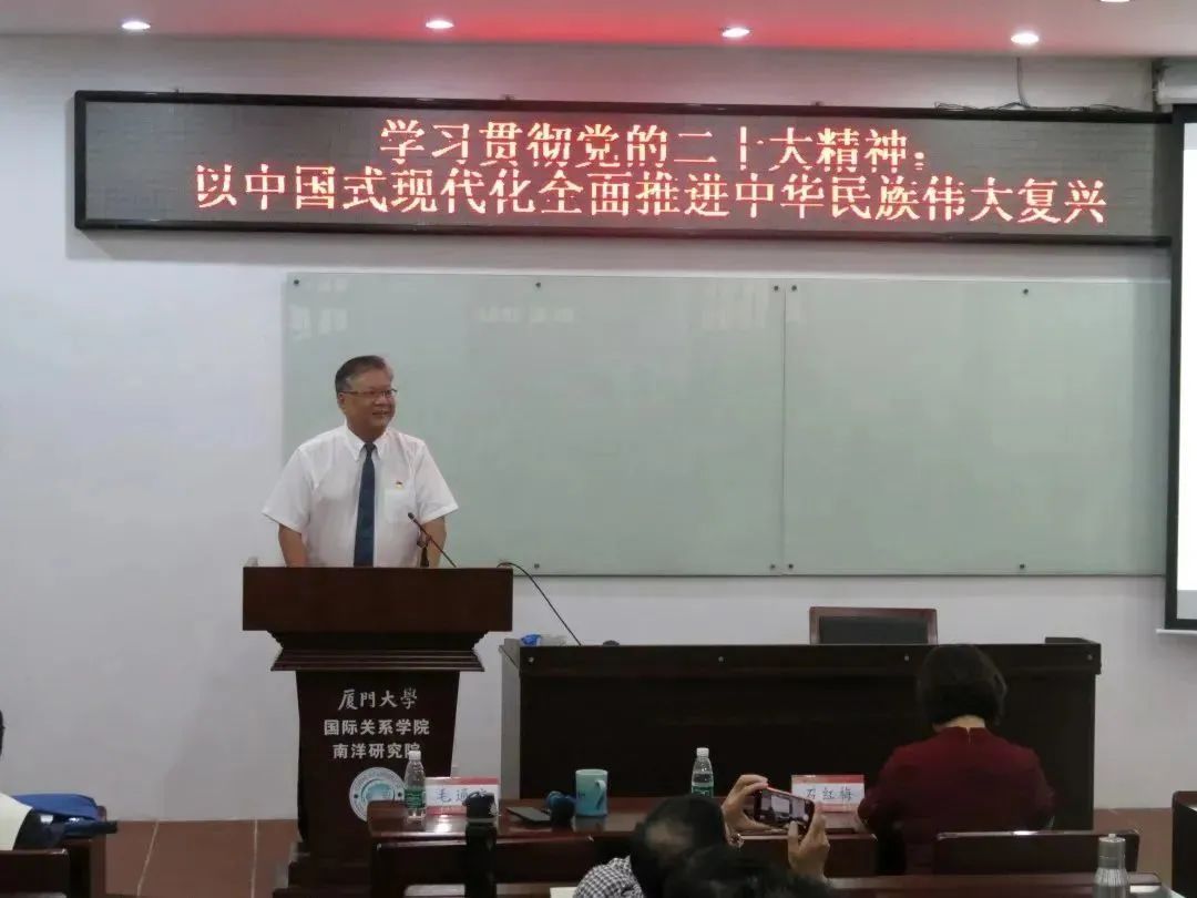 最后毛通文书记对讲座进行了总结,要求全院师生把贯彻党的二十大精神作为当前和今后一段时期的首要政治任务,迅速掀起学习宣传贯彻党的二十大精神热潮,把学习宣传贯彻党的二十大精神和坚决做到“两个维护”结合起来,把学习宣传贯彻党的二十大精神和践行习近平总书记致厦门大学贺信重要精神结合起来,把学习宣传贯彻党的二十大精神和坚持全面从严治党结合起来,将习近平外交思想有机融入学院各项事业,引导师生扎根祖国大地研究思考,汇聚起磅礴的精神力量,在新时代新征程中展现新担当新作为,书写一流建设的奋进之笔。
