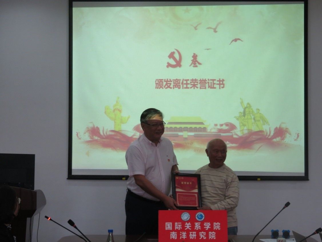 为感谢离退休支部书记吴凤斌老师对学院党建工作的贡献,学院党委书记毛通文为吴凤斌老师颁发离任荣誉证书。