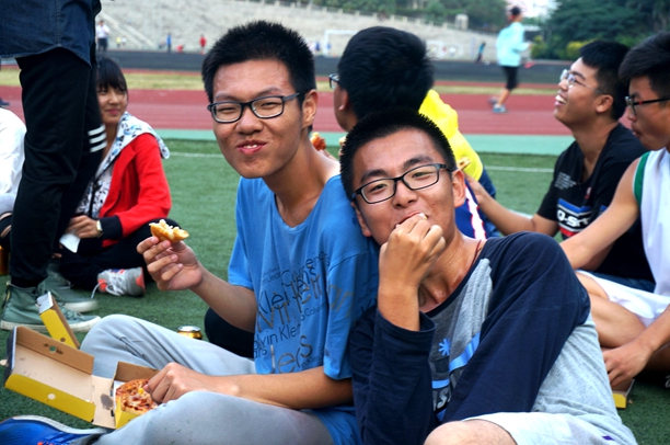 首先,学院党委副书记黄俊清、团委书记兼辅导员沈丽秀老师和老生代表们将带来的披萨和可乐分发给队员们。黄老师和沈老师了解到队员们晚上训练至12点,关切地叮嘱他们要注意身体,并表达了对国关啦啦操队在比赛中取得优异成绩的信心和希望。接下来国际关系学院暨南洋研究院学生会主席陈修文、团总支书记李布言、国关本科2014级啦啦操队教练郑晓婕等老生代表也纷纷鼓舞队员们继续努力。他们分享了自己大一时训练啦啦操的经历,其训练强度不亚于今年,但比赛中的出色表现带来的喜悦和感动使所有汗水都变得有价值。