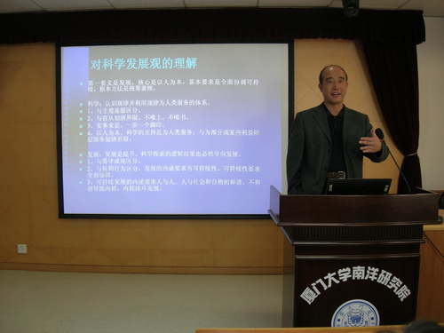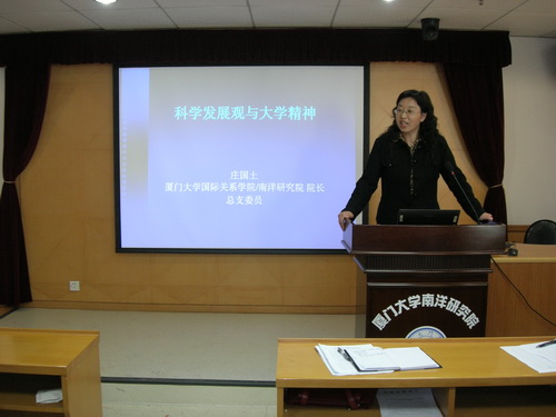 3月25日下午,国际关系学院/南洋研究院在颂恩楼514举办了题为“科学发展观与大学精神”的专题讲座。此次讲座由学院深入学习实践科学发展观领导小组组长庄国土教授主讲,学院党总支书记范丽主持,全体教师党员、学生党员参加了此次讲座,讲座还吸引了本院的部分海外生及外院学生前来听讲。