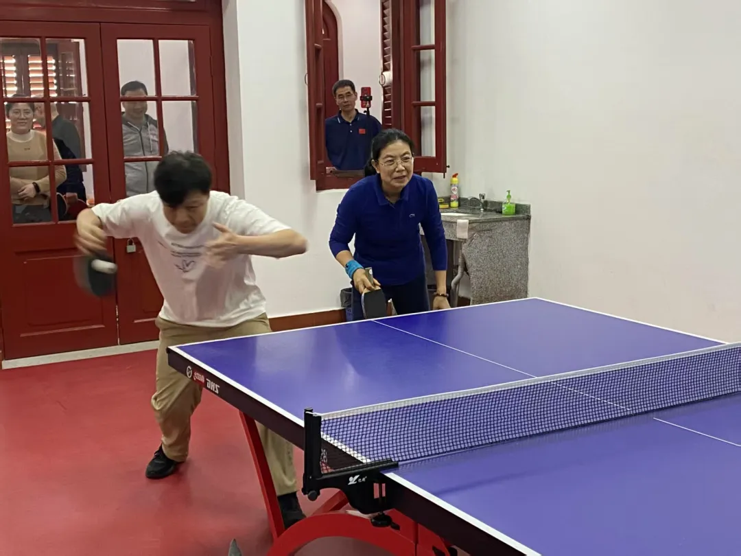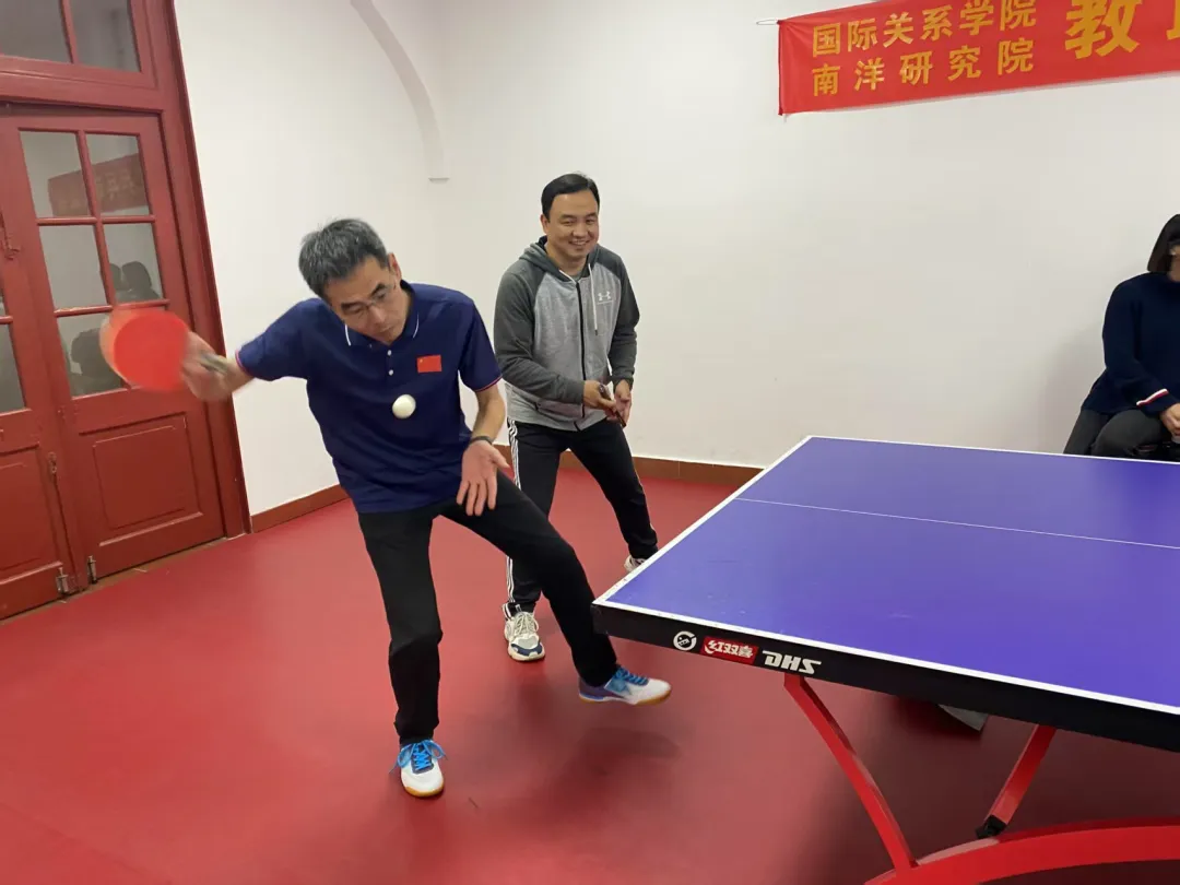 2025年2月22日下午3点,南安楼乒乓球室内充满了紧张与激烈的氛围,国际关系学院/南洋研究院的教职工乒乓球友谊赛顺利举办。此次活动作为新学期的开篇,以双打淘汰赛的形式展开,比赛既富有竞技性,又不失趣味性。
