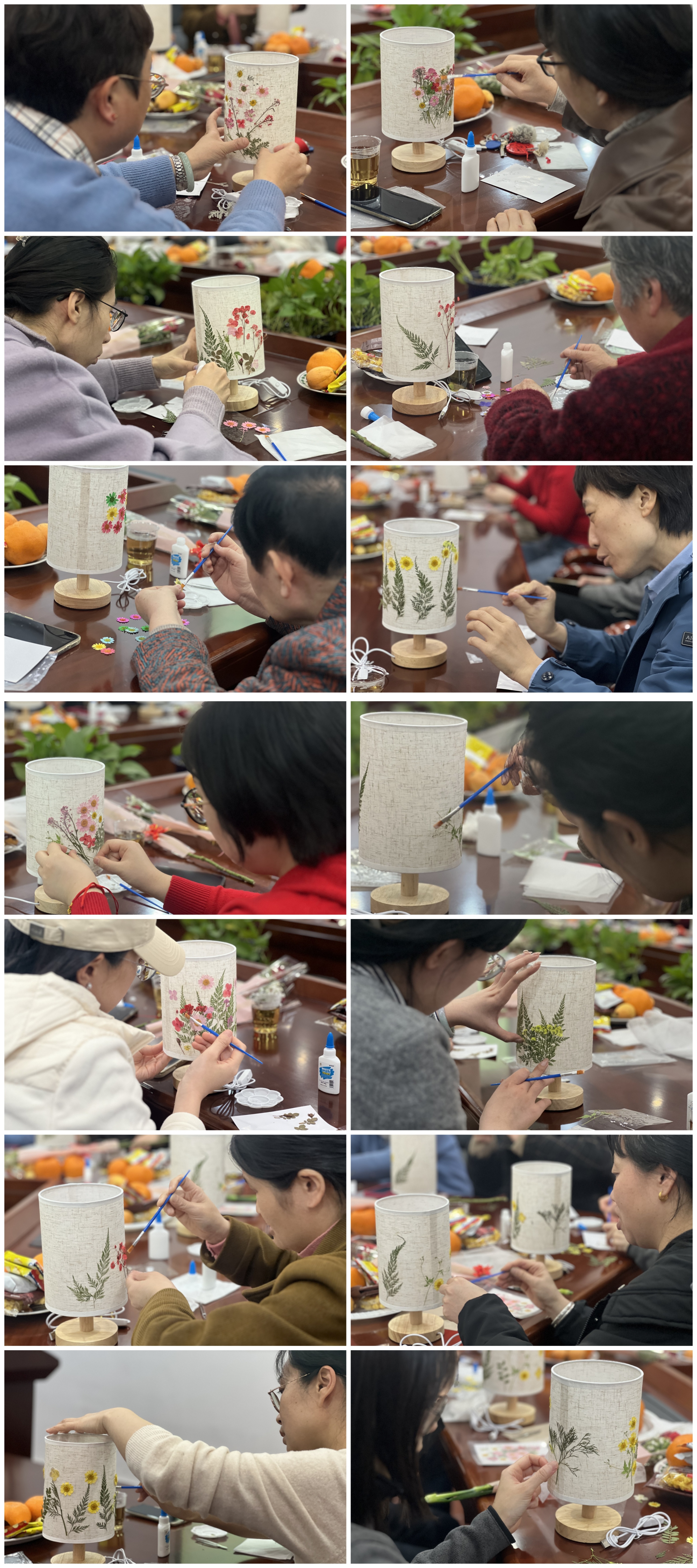 活动过程中,老师们认真学习、积极交流。经过脱水、保色、压制和干燥处理的干花,通过巧妙搭配粘贴在灯罩上,形成一盏盏独特又精美的台灯,各有特点、异彩纷呈。