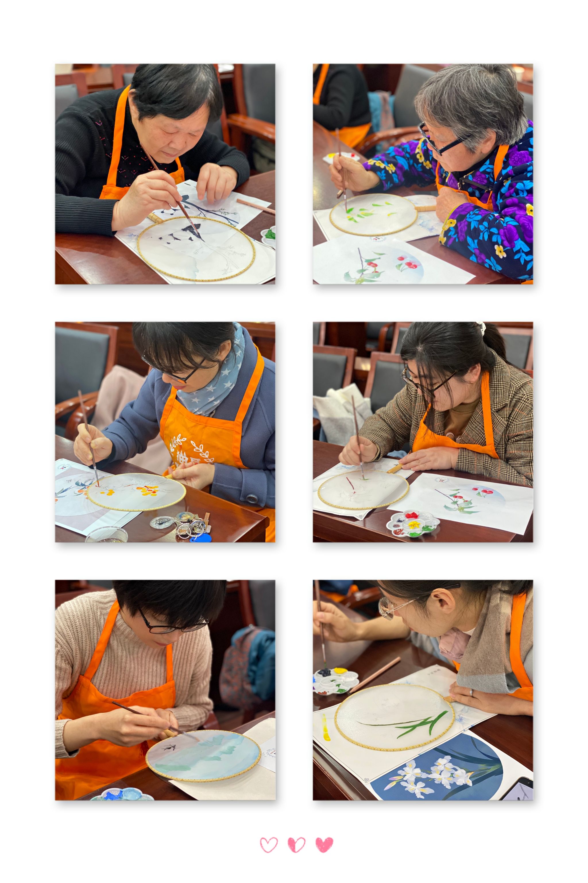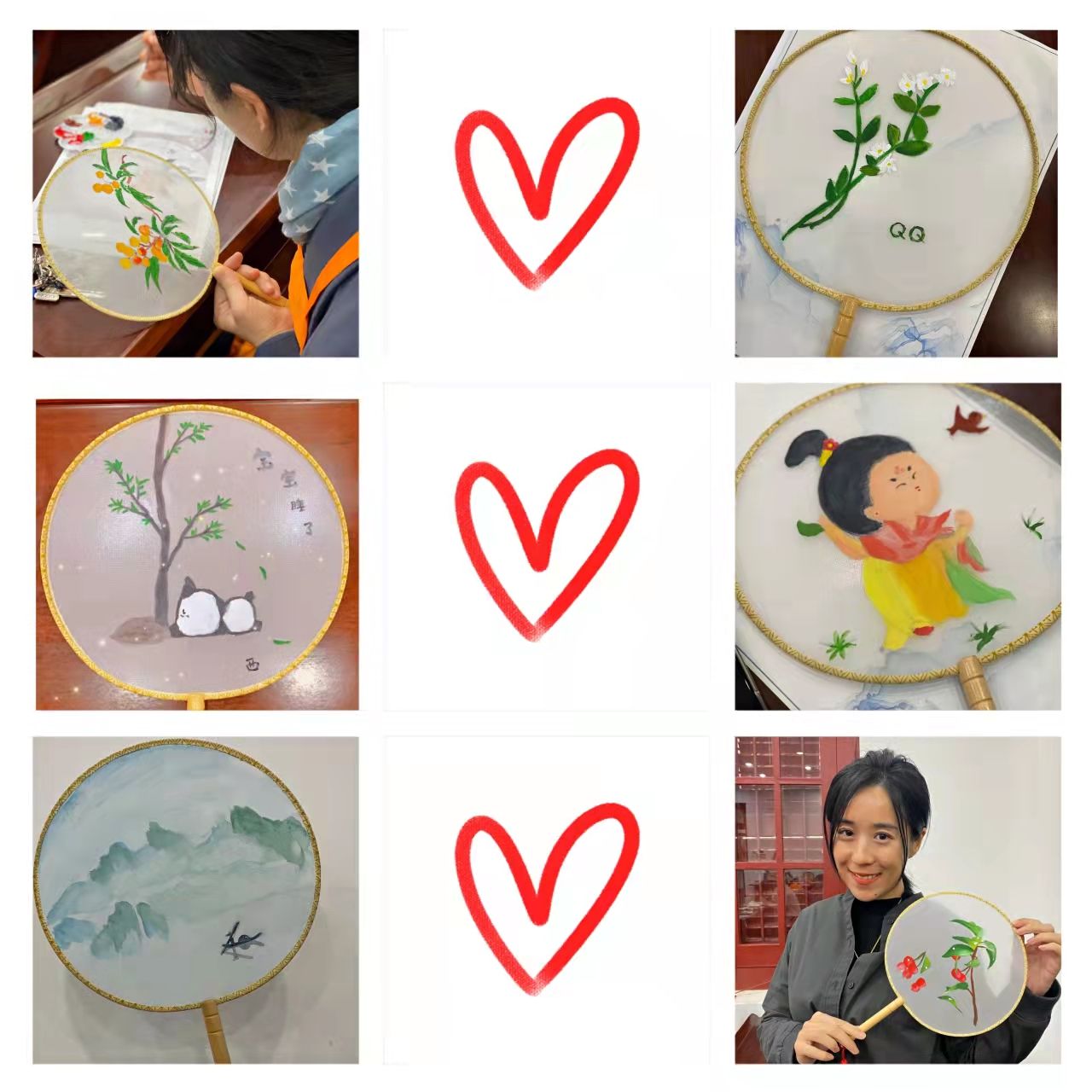 接下来,指导老师又对大家的作品辅助完善,绘上图案的团扇,如藤编幽梦彩、罗幕涌寒金、屏风舞华颜,恰似画全的龙被点亮了眼睛,刹那间鲜活明艳起来,成为生动有情的艺术品,让人不由赞叹我院女教职工的秀外慧中、心灵手巧!