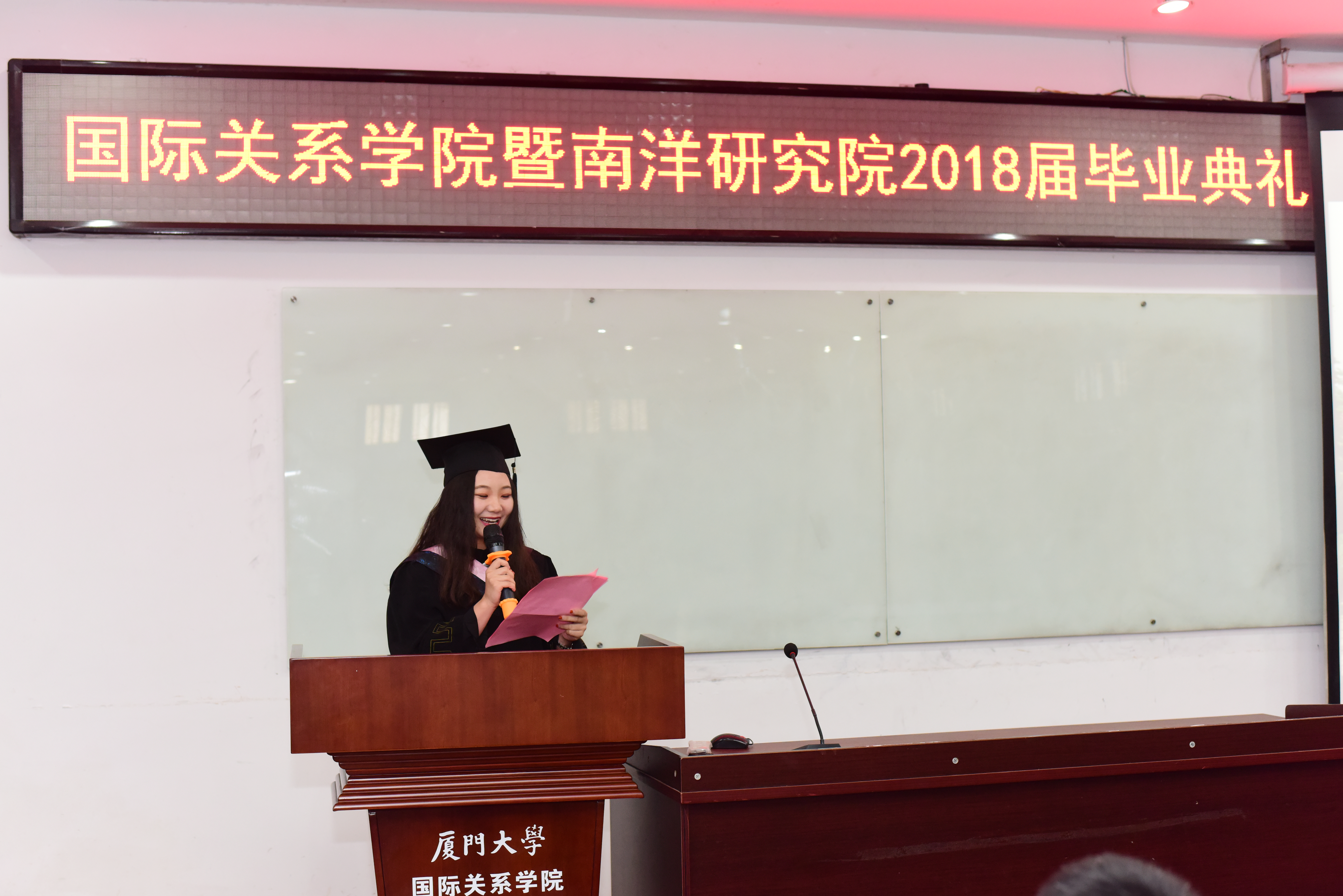 奏唱国歌后,国际关系学院/南洋研究院院长李一平首先致辞,他对18届的毕业生同学表达了殷切的期望。他强调当今的国际局势错综复杂,充满着机遇和挑战,我们国际关系学院的学生应该不断提高自己的能力,毕业之后在更广阔的天地里各展其能。正是有了年轻一代的奋斗,每个人、每个家庭和我们的国家才充满希望,他相信在座的各位同学都会有光明而美好的前景。教师代表沈燕清老师随后发言,她希望同学们能把健康放在首位,同时选择能实现自我价值的事业,心中有爱,勇敢追爱,国际关系学院/南洋研究院永远是大家温暖的港湾。