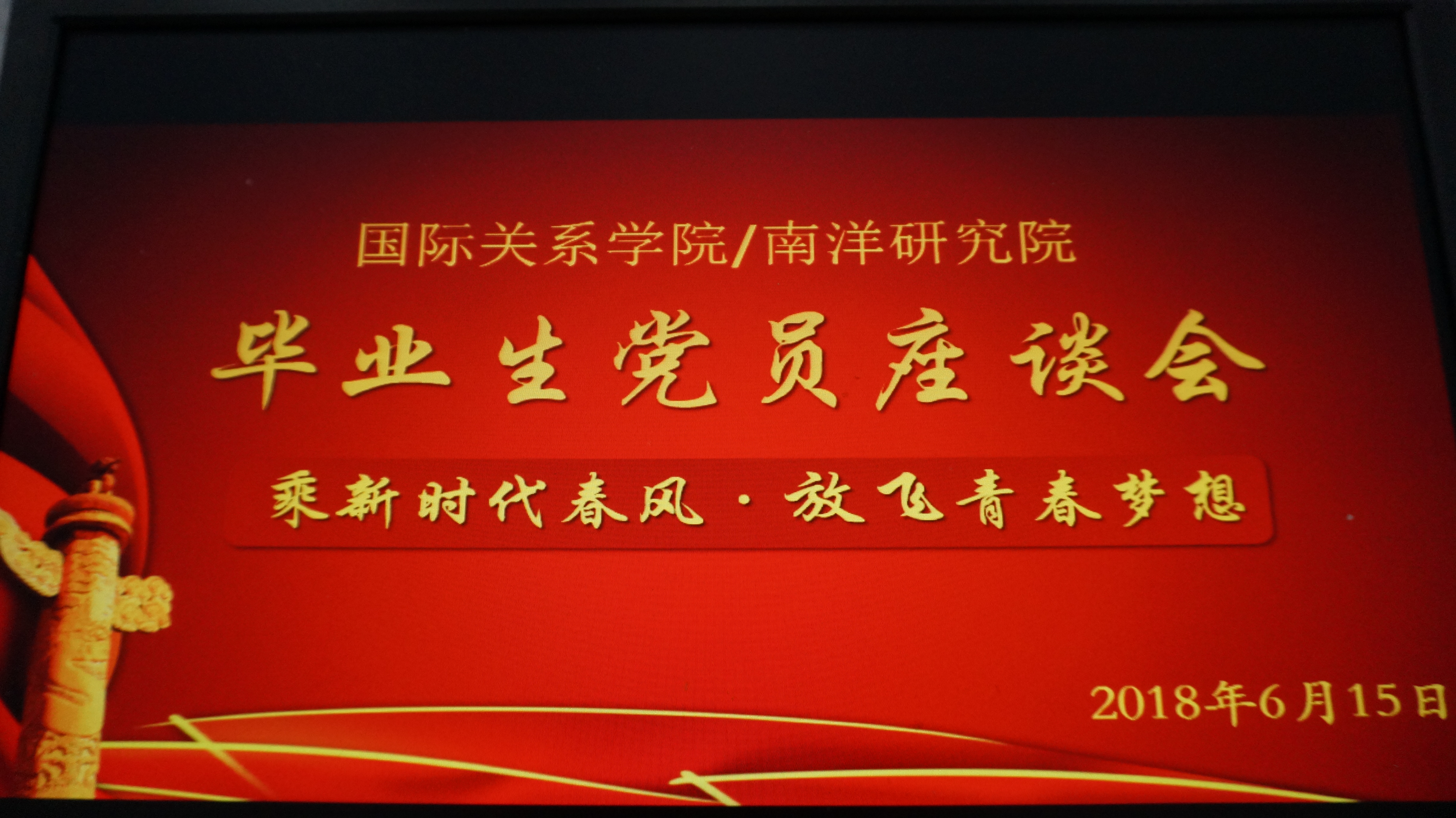 6月15日,国际关系学院/南洋研究院2018届毕业生党员座谈会在南安楼303顺利举行。院党委书记范丽老师、院党委副书记徐跃进老师、辅导员郭晓玲老师出席了本次座谈会。