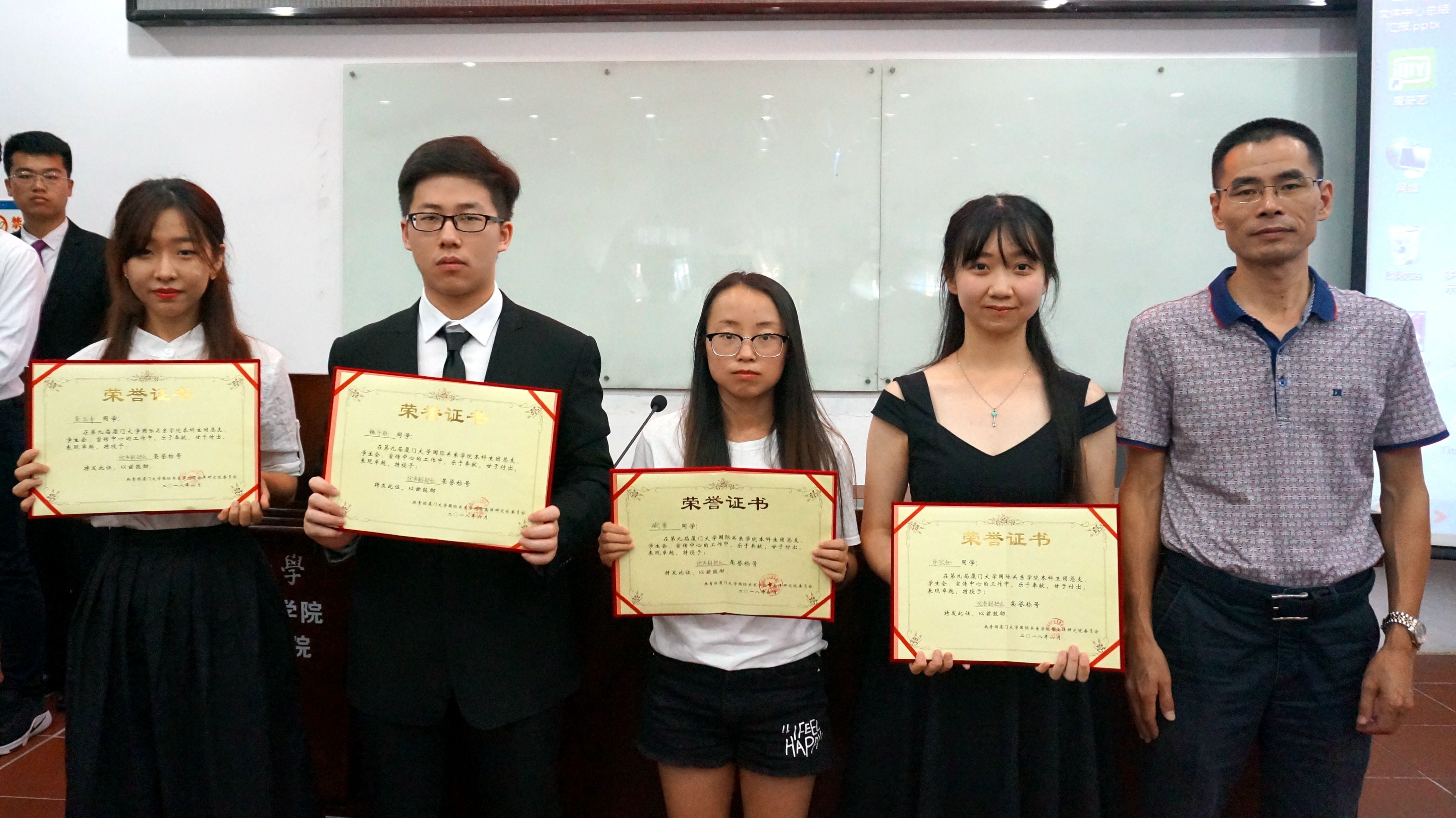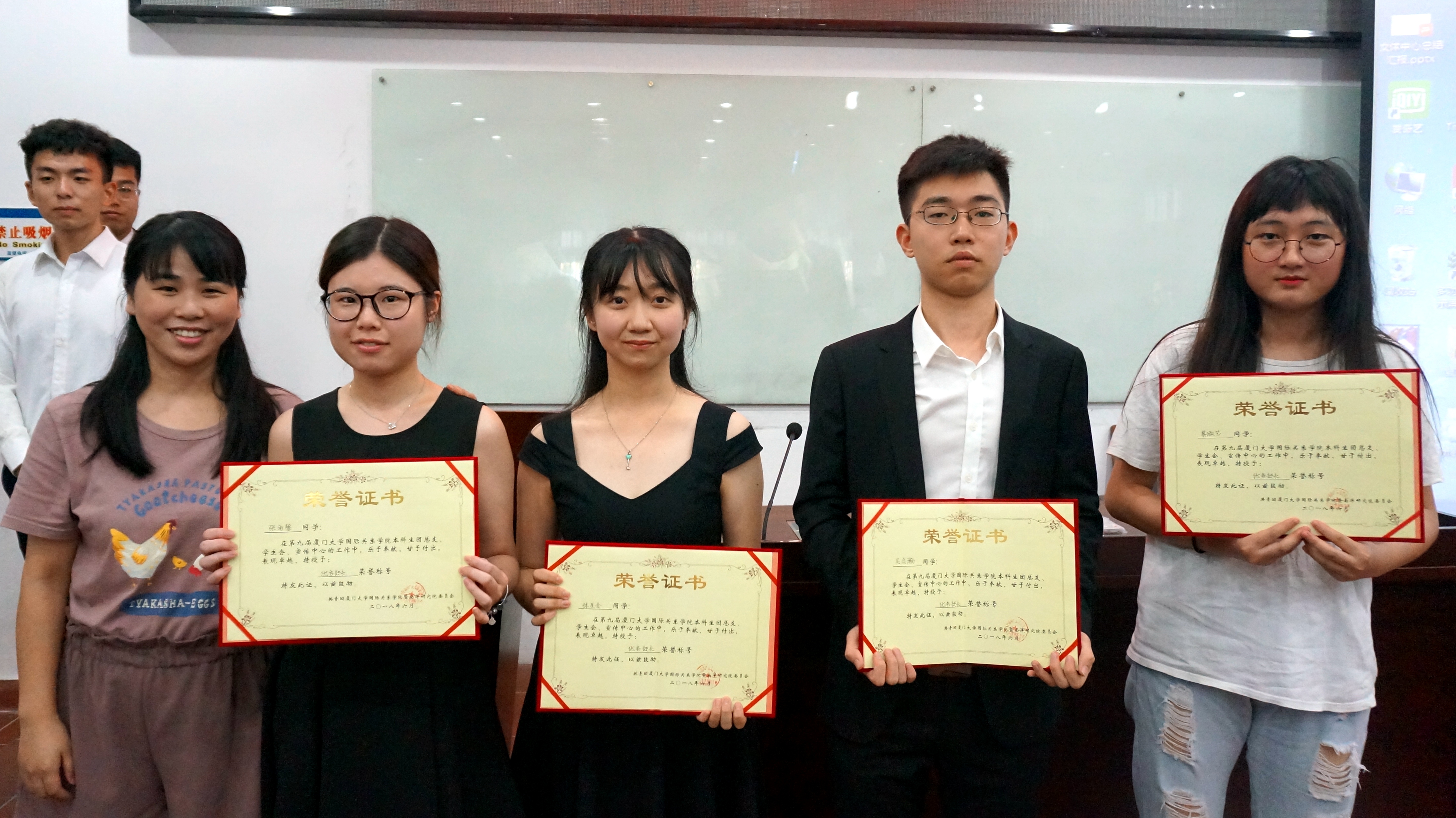 其后,由本科生团总支部书记孙志强宣布了本次评奖评优考核名单,到场的两位老师为获奖同学颁发了证书。