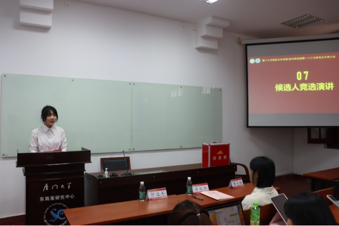 报告在热烈的掌声中结束,黄笑天同学宣读第二十三届院研究生会主席团候选人名单和《厦门大学南洋研究院第二十三届研究生代表大会选举办法》。随后三位候选人分别就自身对研究生会工作的认识以及对未来工作的规划进行了演讲。秉持着公平、公正、公开的原则,现场的同学们在工作人员的组织下进行了无记名差额选举投票。最终,魏燕丽和林沁两位同学胜出。