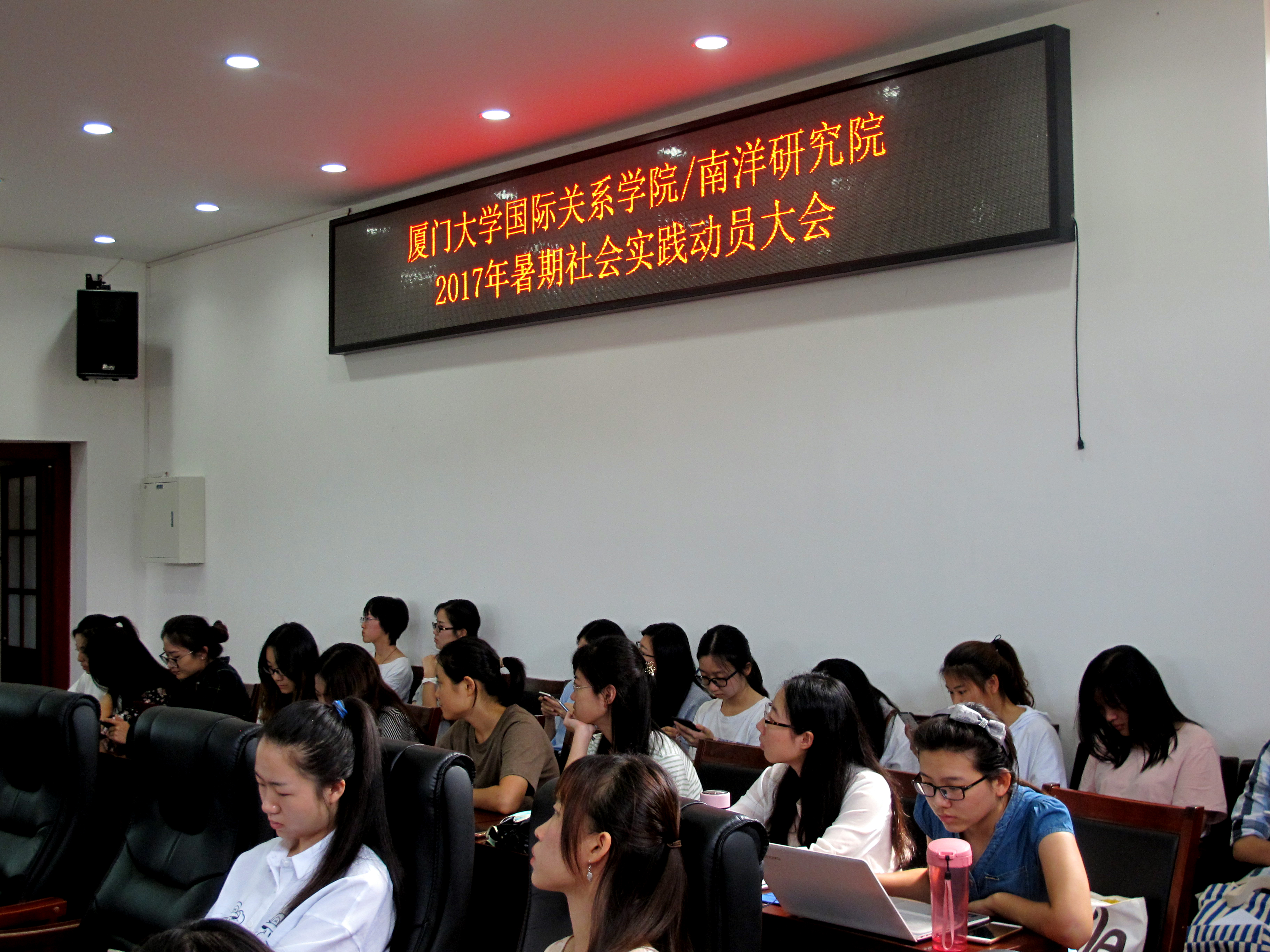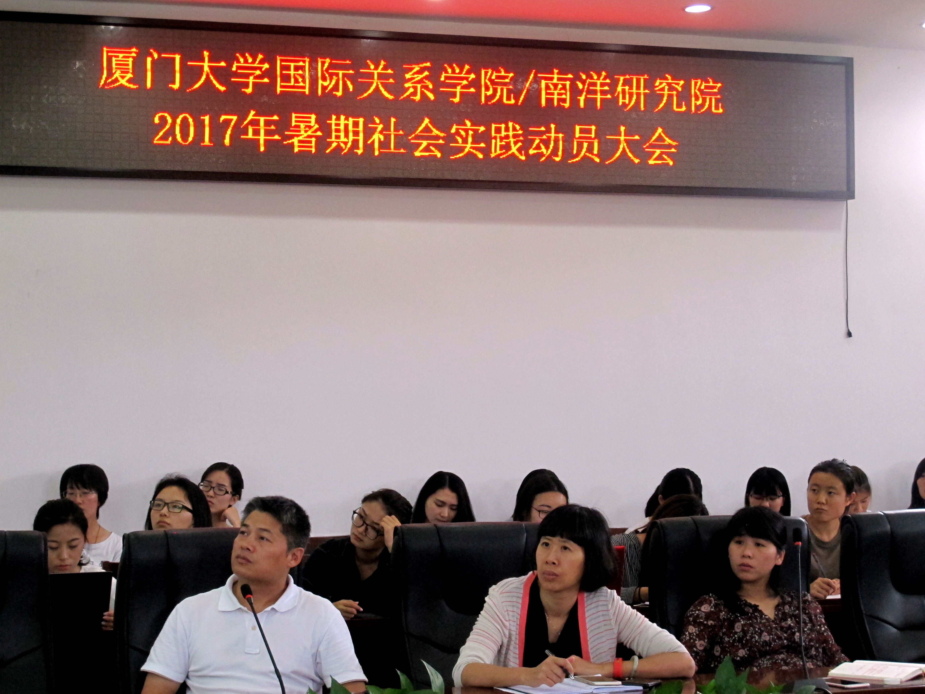 5月17日下午14:30,厦门大学国际关系学院暨南洋研究院2017年暑期社会实践启动仪式在南安楼301(3)顺利举行,拉开了本年度的暑期社会实践的序幕。本次仪式由团总支社会实践与就业促进部部长华晓芸主持,2015级和2016级本科生参加了仪式。此外,出席本次社会实践启动仪式的还有厦门大学国际关系学院暨南洋研究院党委副书记黄俊清、团委书记沈丽秀、辅导员郭晓玲和本科生教学秘书朱鸿婕老师。