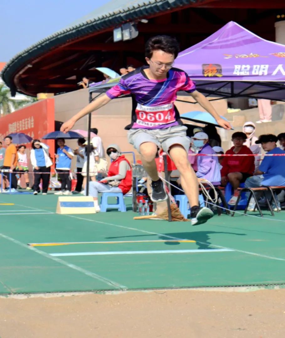 三级跳远比赛中,女子本科生组代表杨烨琪纵身一跃,在空中定格成优美的弧线,最终取得46分的成绩;男子本科生代表闫申的飒爽英姿引人注目。